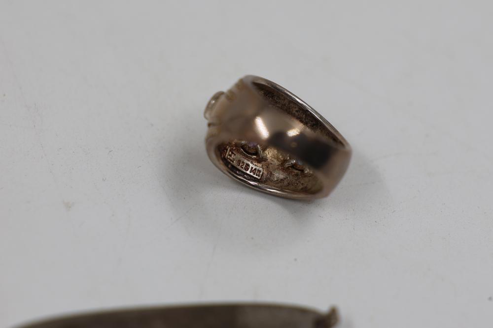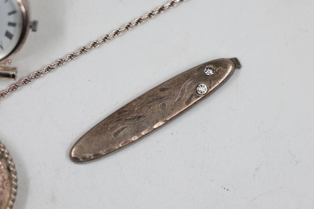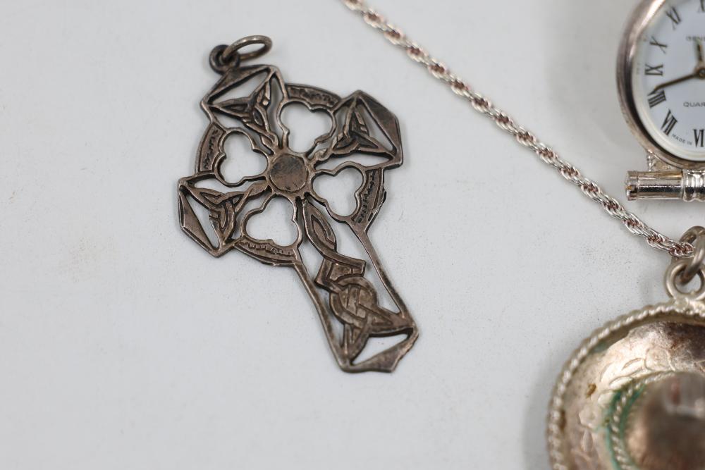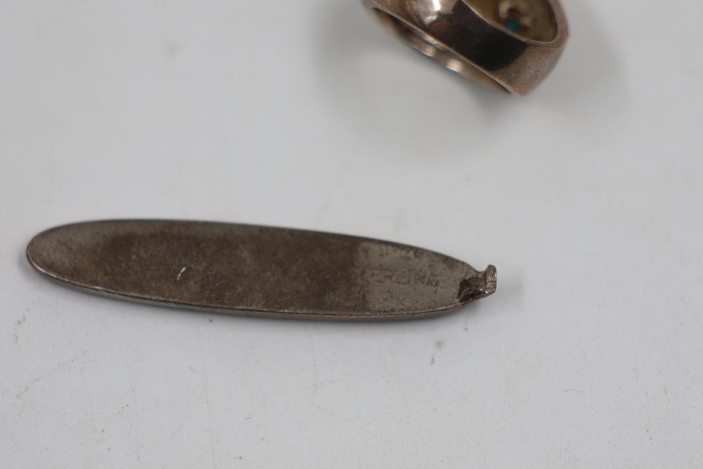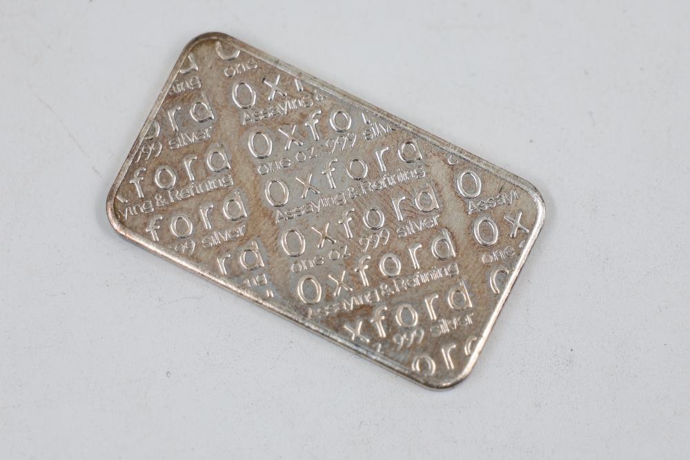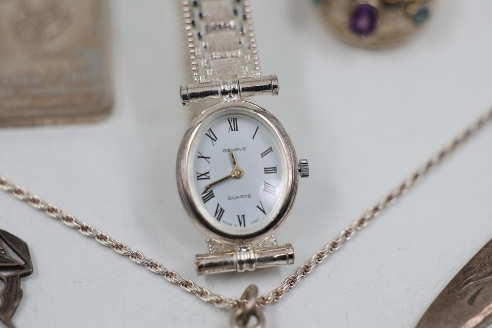 Sterling Silver Jewelry, 1984 Alaska Silver Bar, and 14k Stamped Ring. Includes a sterling silver Alaska 1984 25th Anniversary silver bar Stamped "Oxford", sterling stamped silver wristwatch, sterling silver chain necklace with pendant, sterling adn 14k stamped ring with purple and blue stones, and cross pendant. Sterling weight being 48 grams. Total weight being 103 grams.