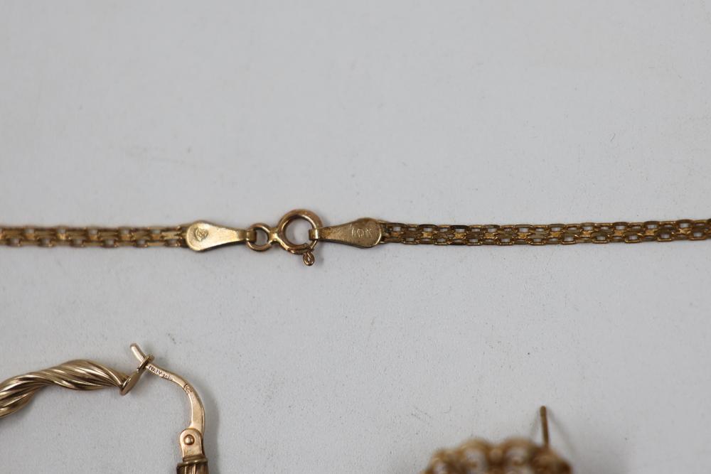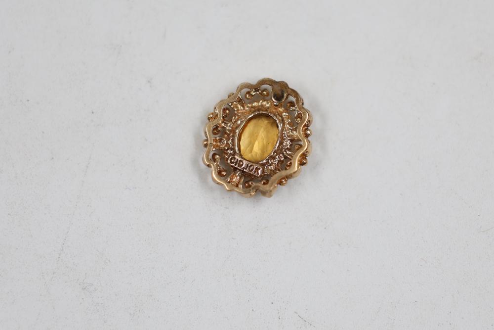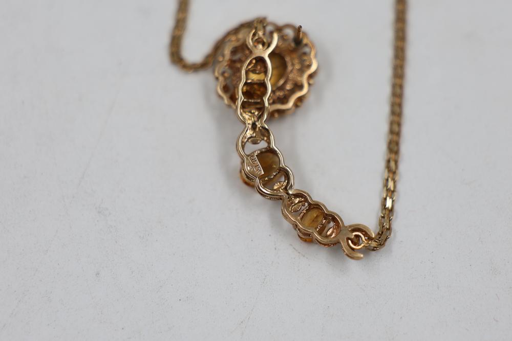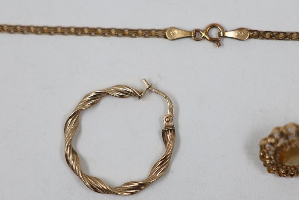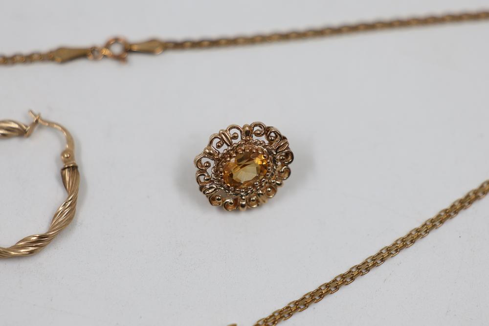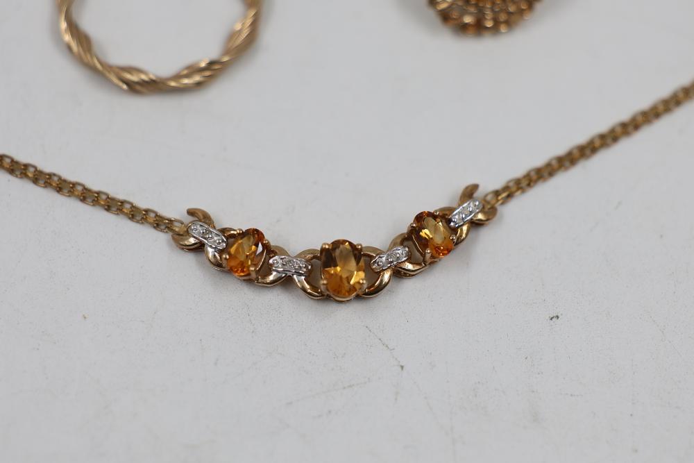 10k Gold Stamped Jewelry Set with Necklace, Earring, and Pin. Includes a delicate gold necklace featuring orange gemstones, a twisted design gold earring, and an ornate gold pin with a central orange gemstone. Total weight is 8 grams.