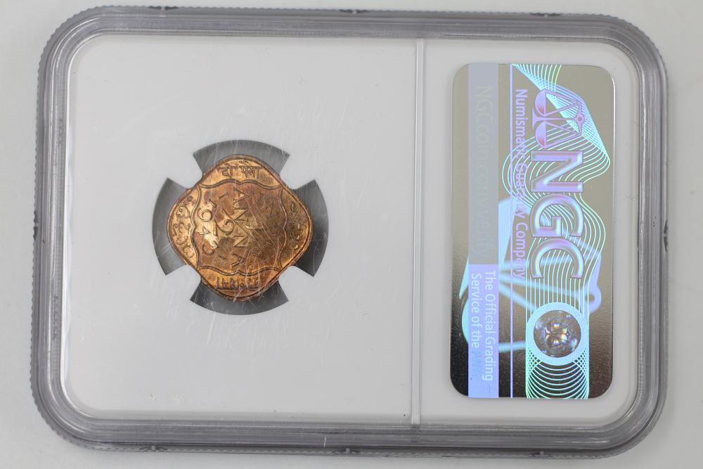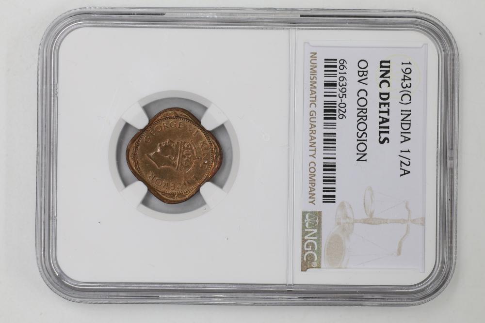Foreign Coins and Currency including 1943 India 1/2 Anna and 1918 Russian Banknotes, coins from China, India, Mexico, and Tibet graded by NGC in protective holders. Conditions are variable.