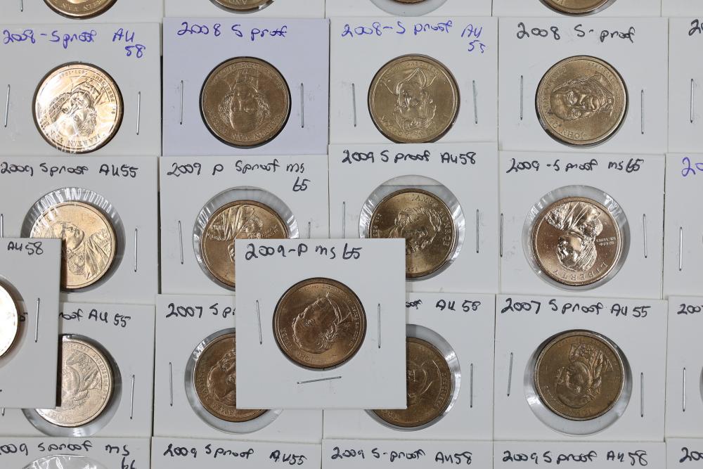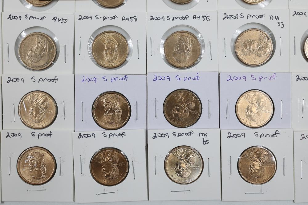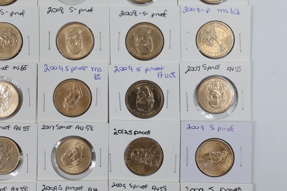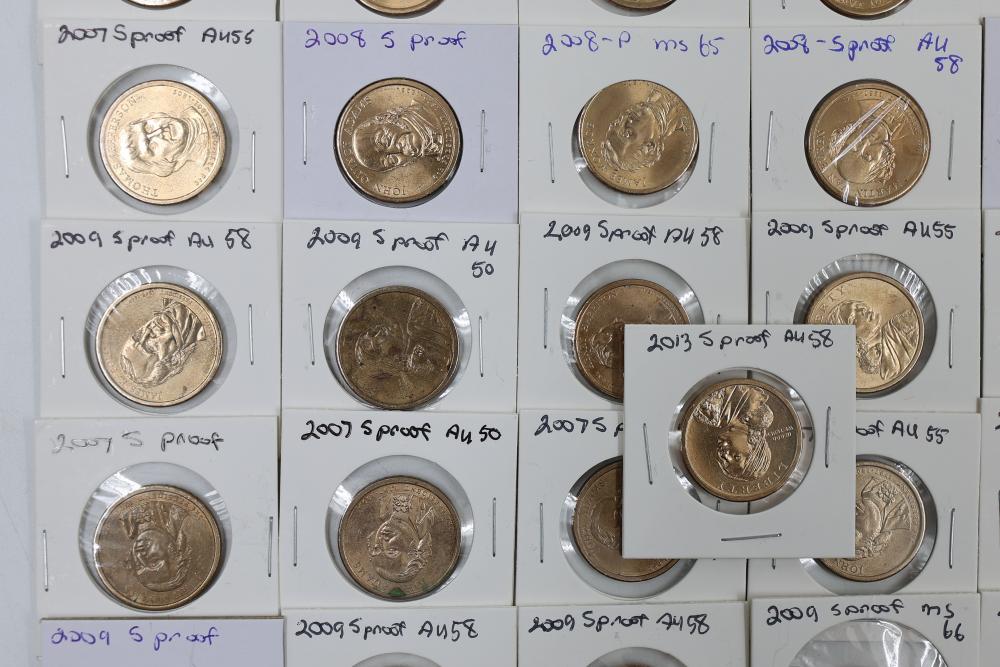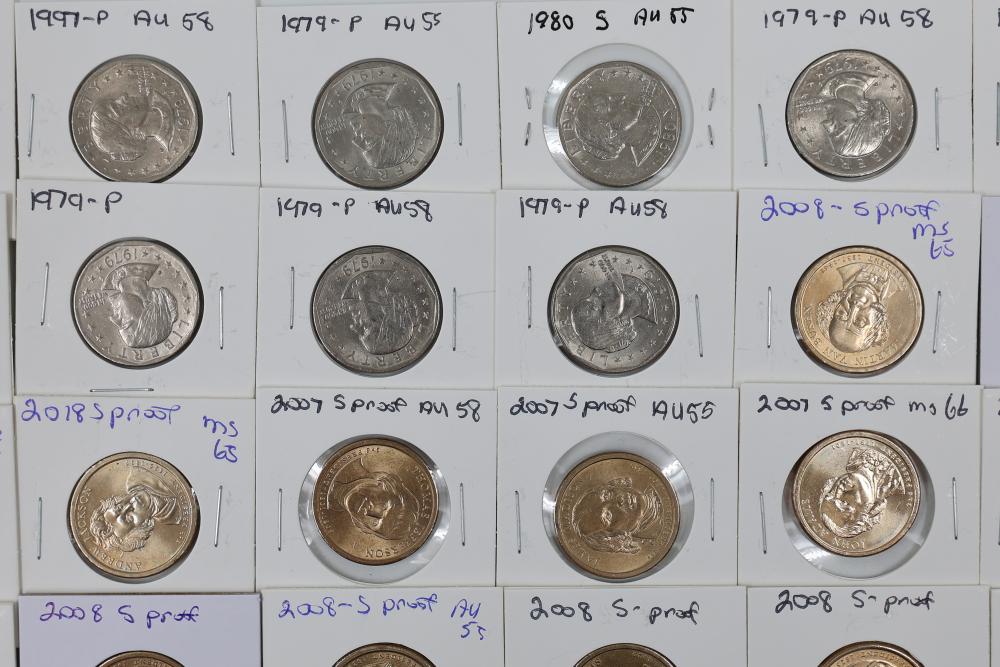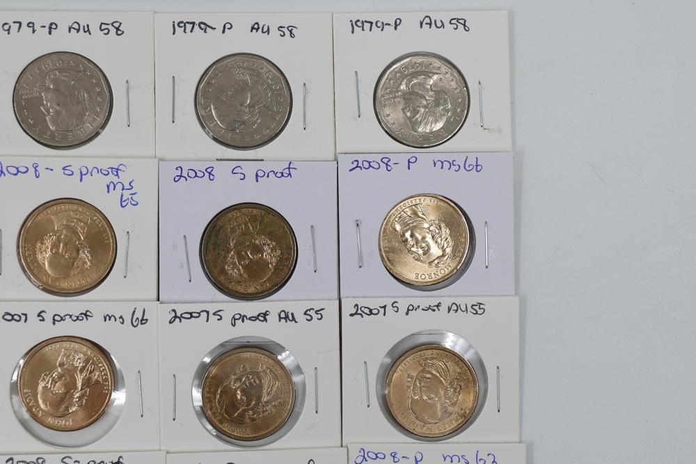 U.S. $1 Commemorative Presidential and Susan B. Anthony from years such as 1979, 1980, 1997, 2007, 2008, 2009, 2012, 2015, and 2018. Conditions are variable. 92 coins in total.