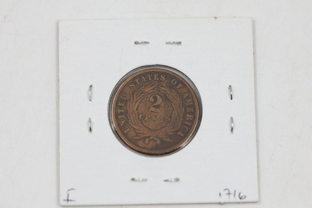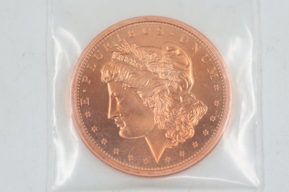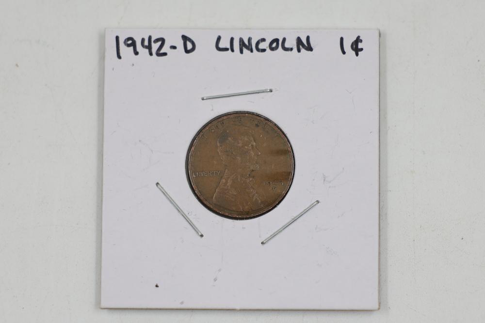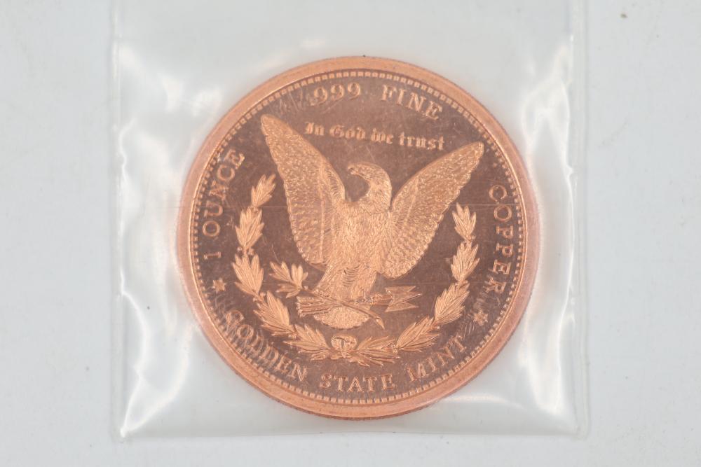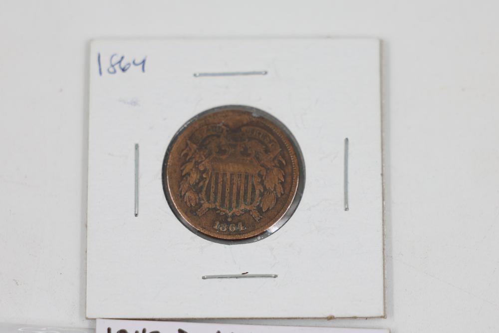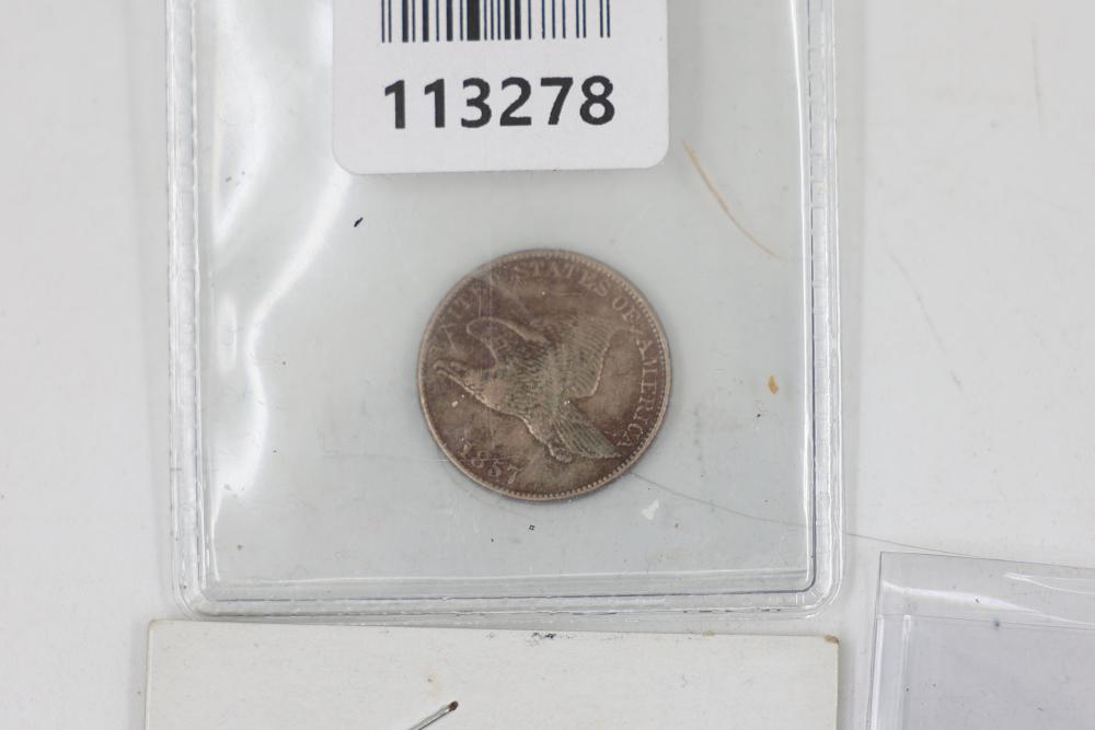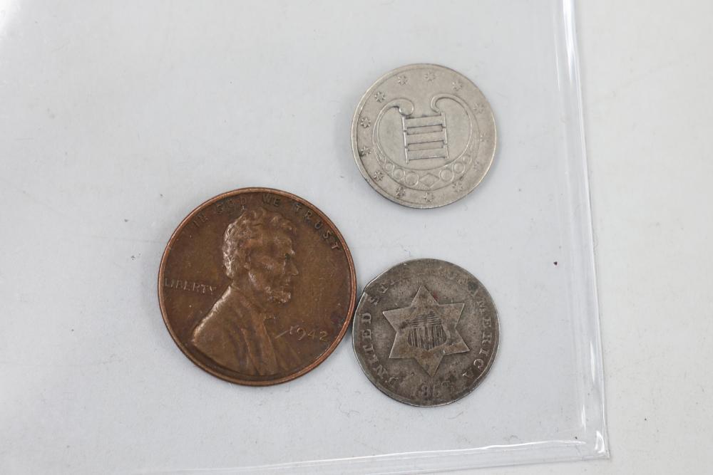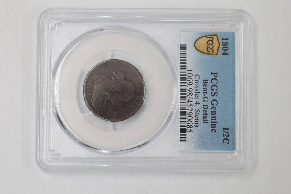 U.S. Coins including a slabbed and PCGS graded 1804 Half Cent, an 1864 2-cent coin, a 1942-D Lincoln cent, 1853 and 1858 3-cent coins, and a 1oz .999 Fine Golden State Mint Copper Coin with the Morgan motif.