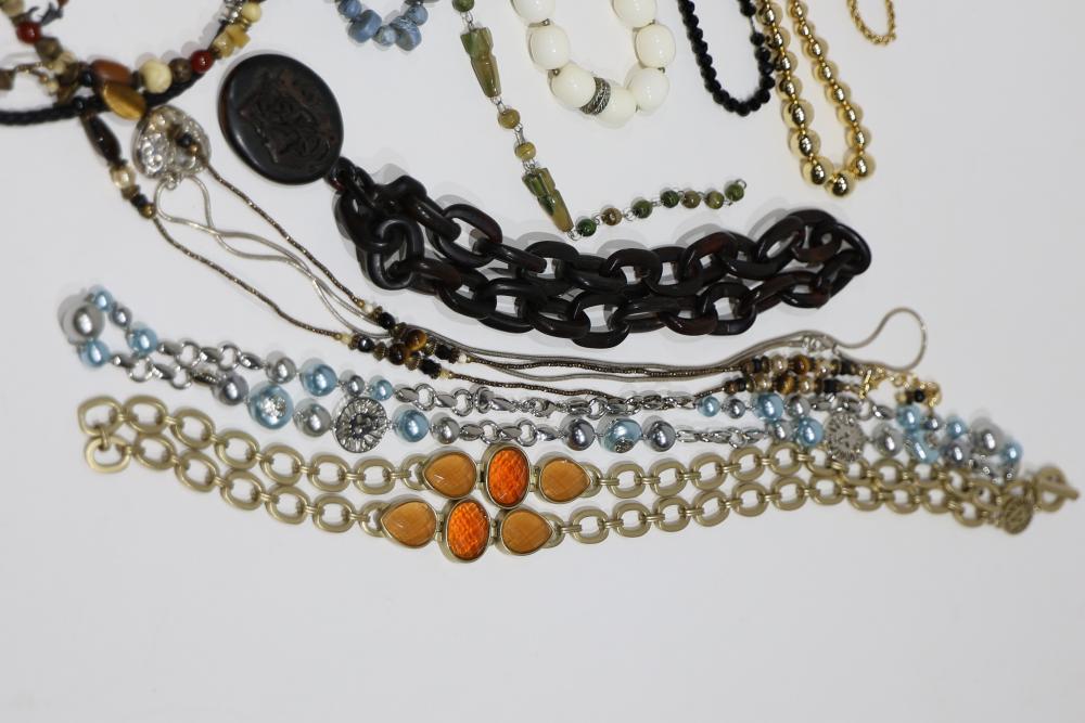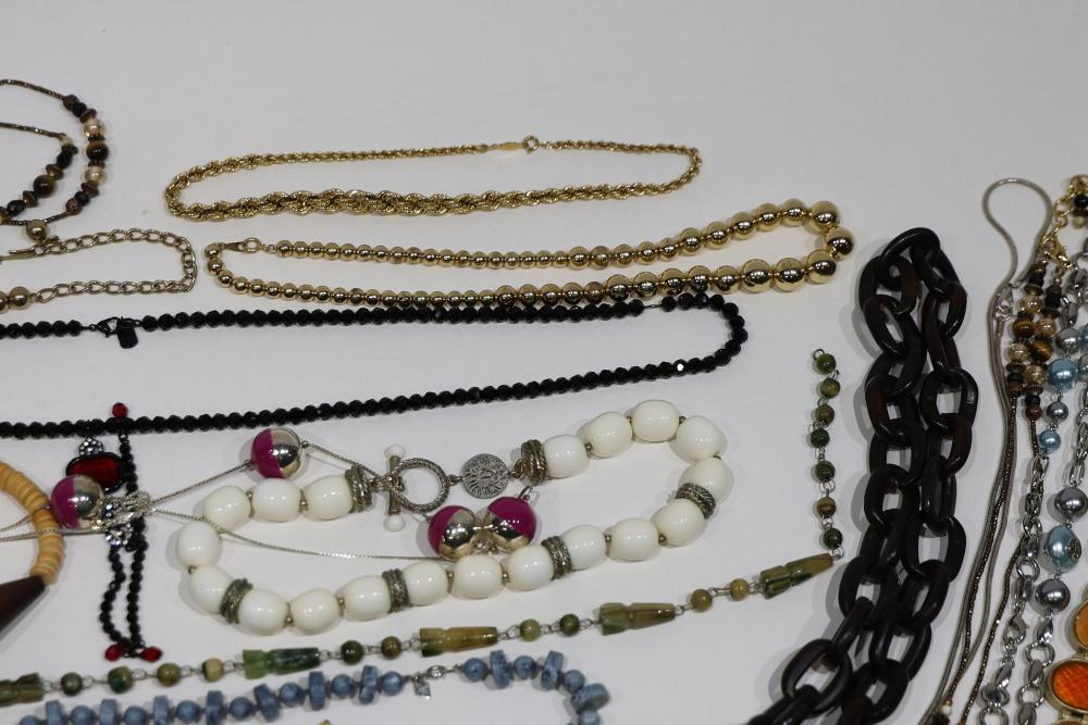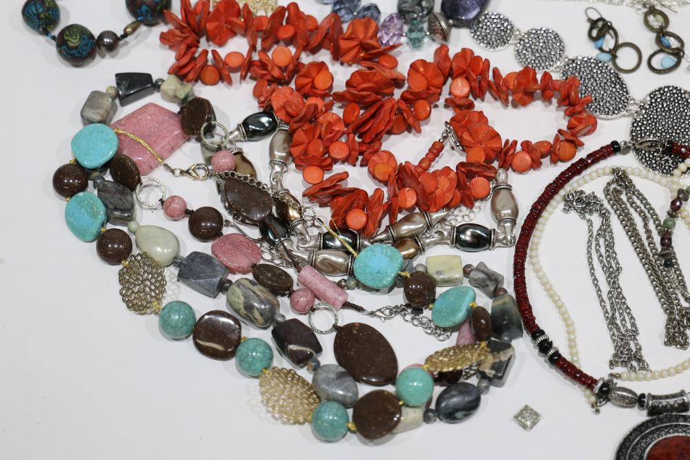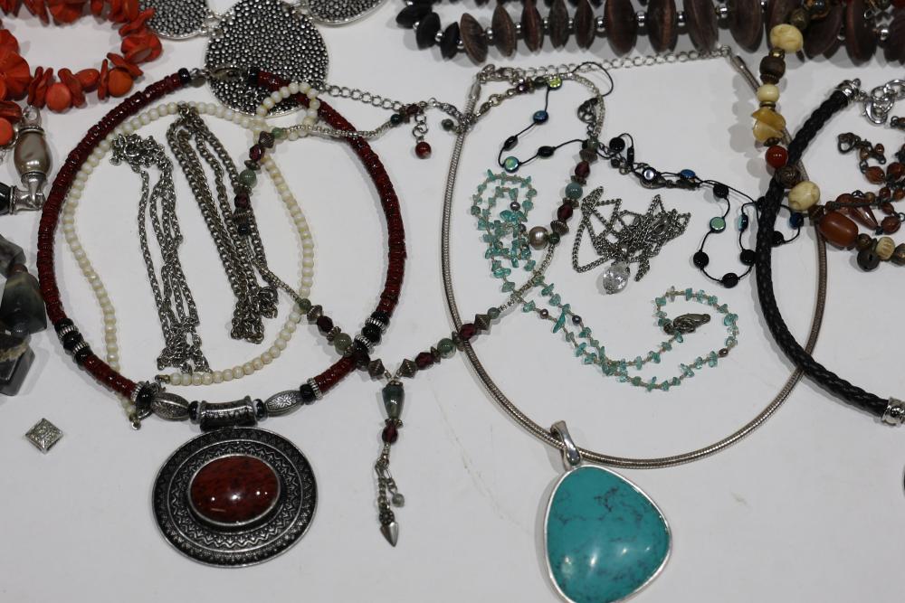 Costume Jewelry including necklaces, beaded designs, and pendants. Items feature a variety of materials, designs, and embellishments, including turquoise, coral-like beads, metal elements, and intricate pendants. Includes both chain and beaded styles, as well as a mixture of colors and shapes.