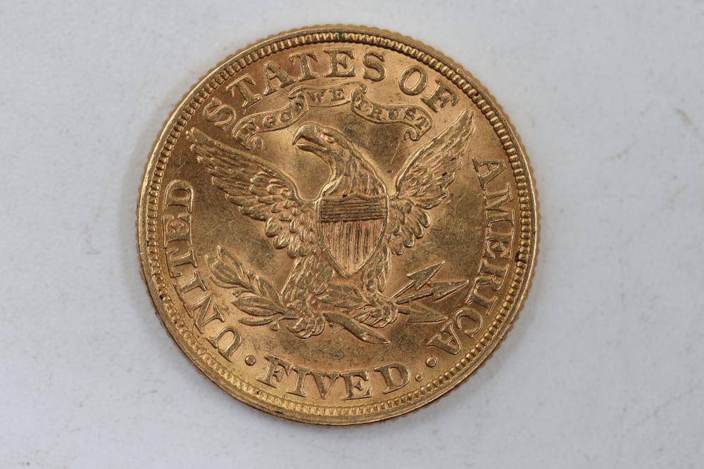 24k 1895 Liberty Head Gold Coin. Features the obverse Liberty Head design and reverse eagle motif. Secured diagonally on a beige velvet backing with a ribbon. Tested with JSP solution. Total weight being .3oz.