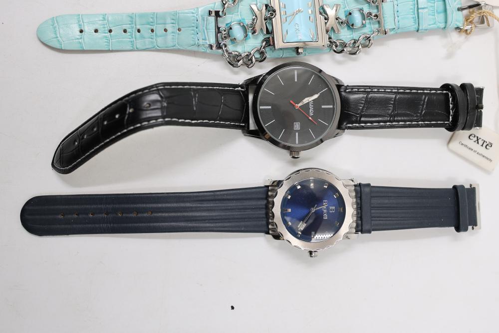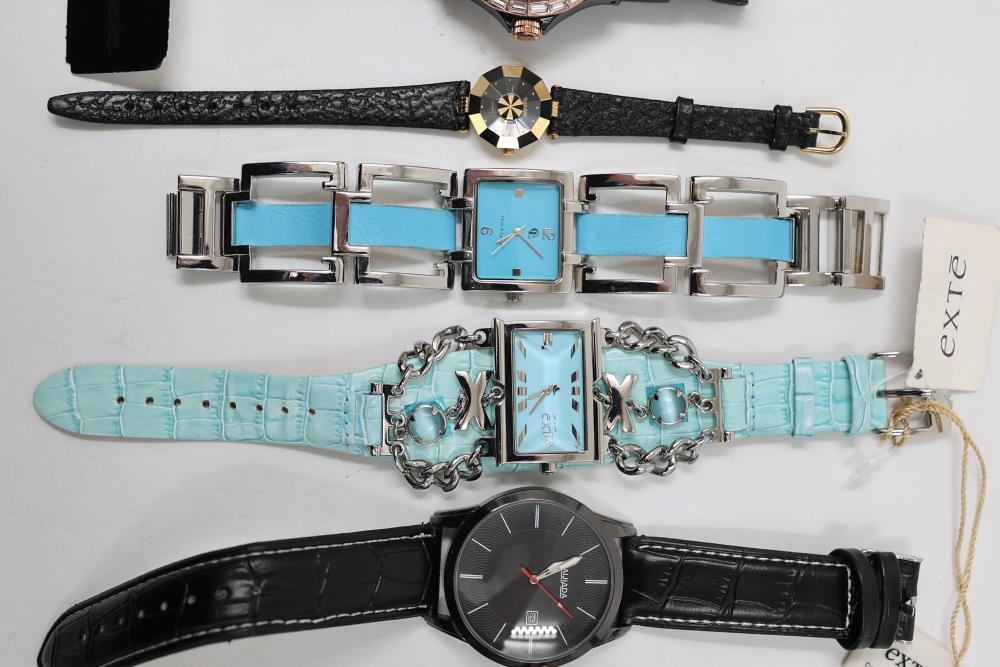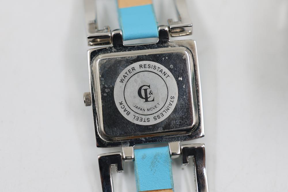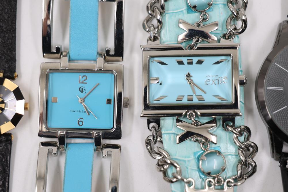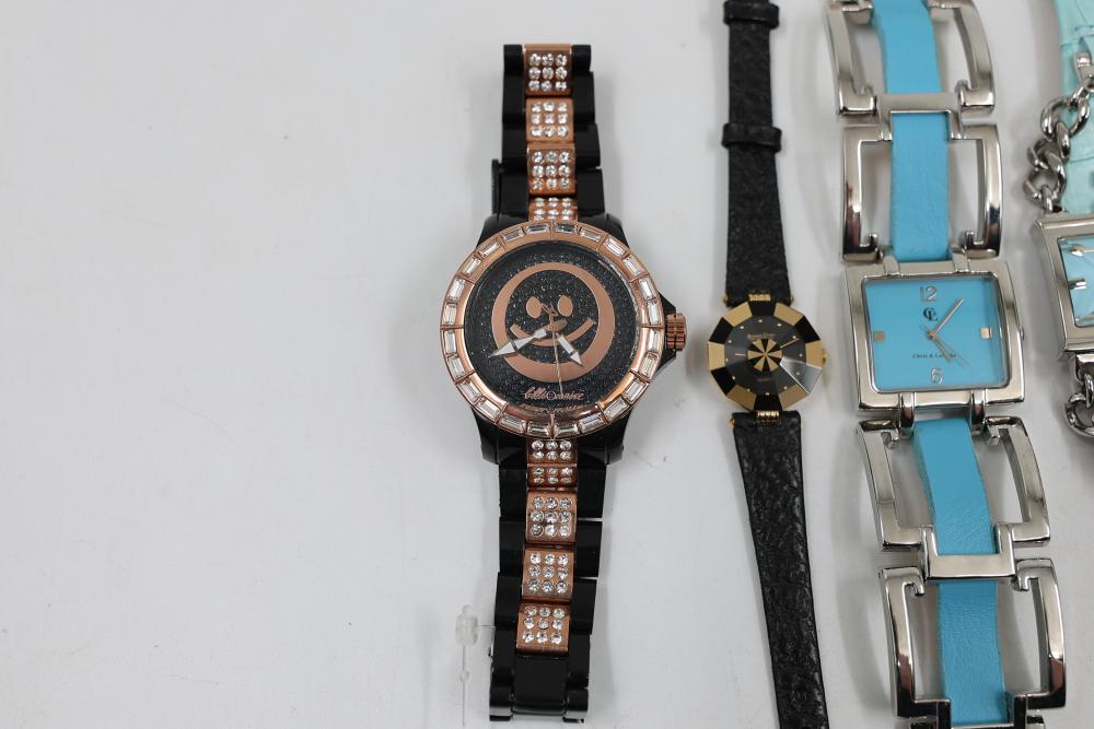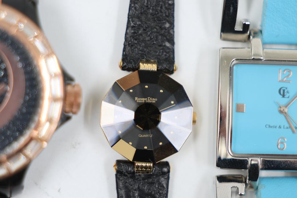 Six Wristwatches With Leather and Metal Bands from brands such as Bugatti, Baijiada, Roven Dino, and others. Some watches are water-resistant with designs featuring decorative elements such as chains and enamel. Functionality unknown.