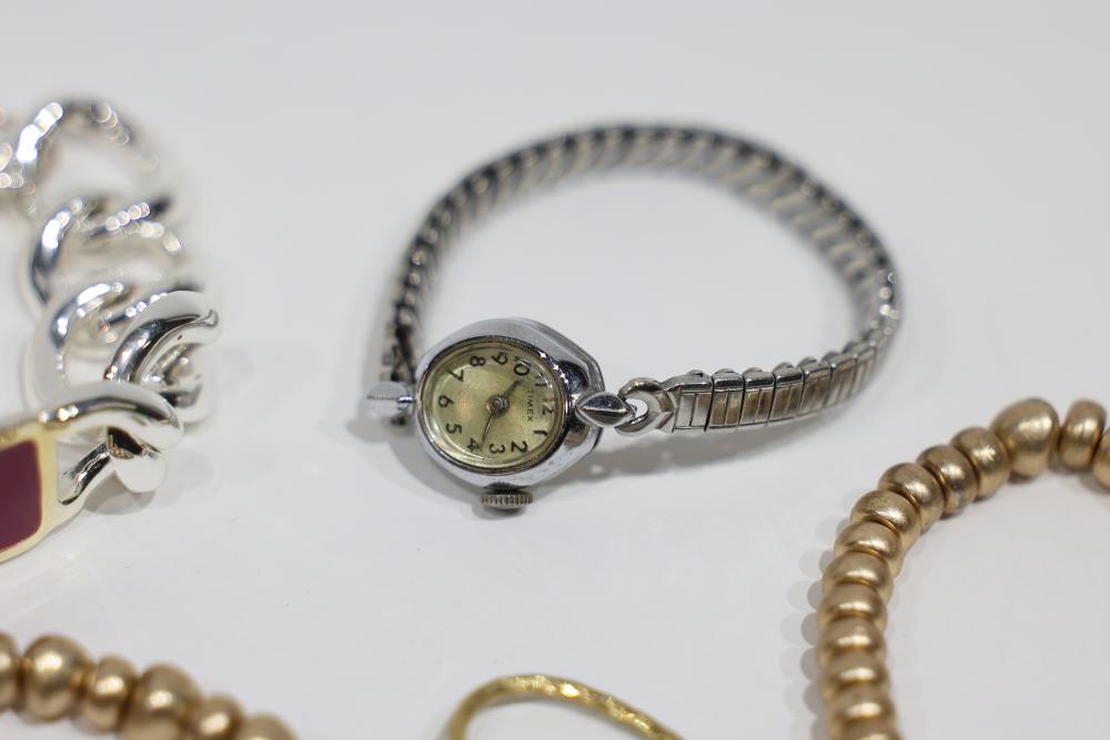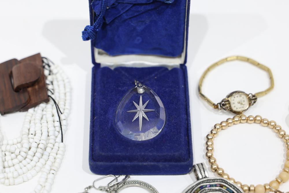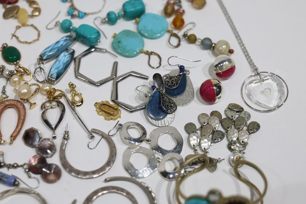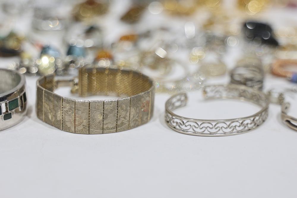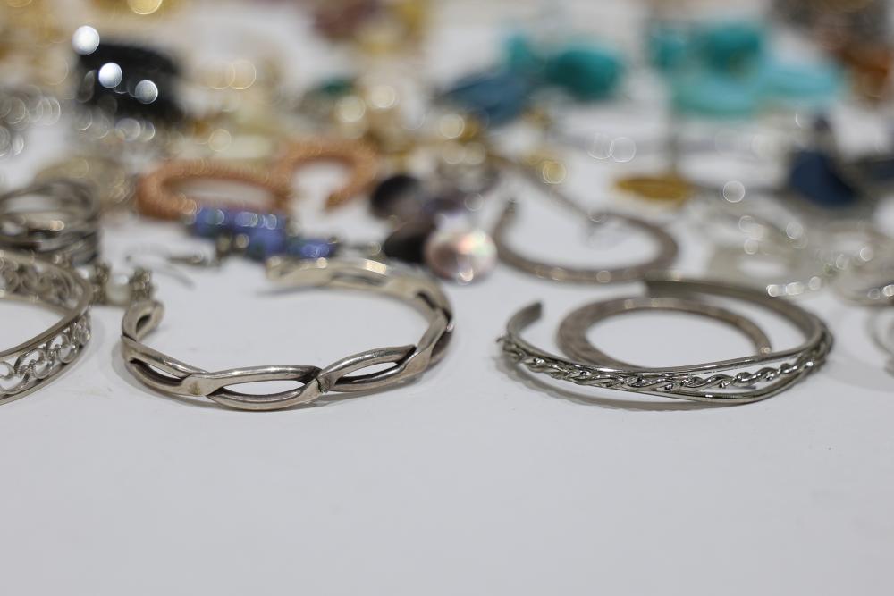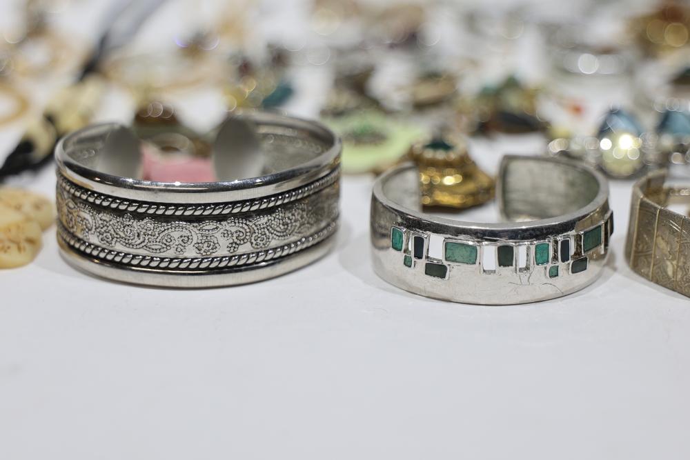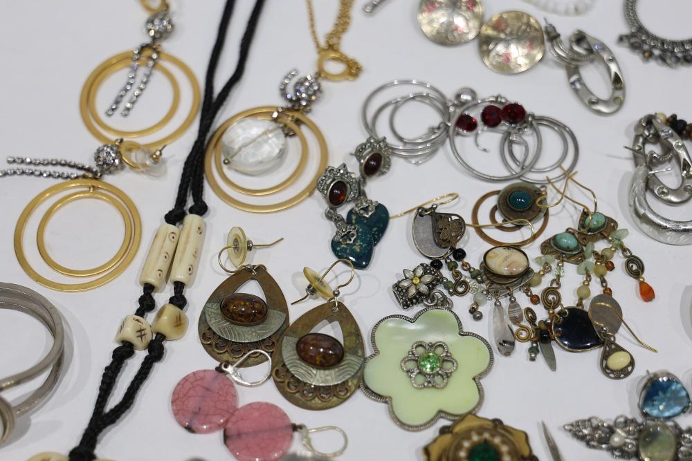 Costume Jewelry assortment including bracelets, necklaces, earrings, and brooches featuring various metals, beads, and decorative elements. Includes clip-on and pierced earrings, layered necklaces, statement pieces, and bangle-style bracelets.