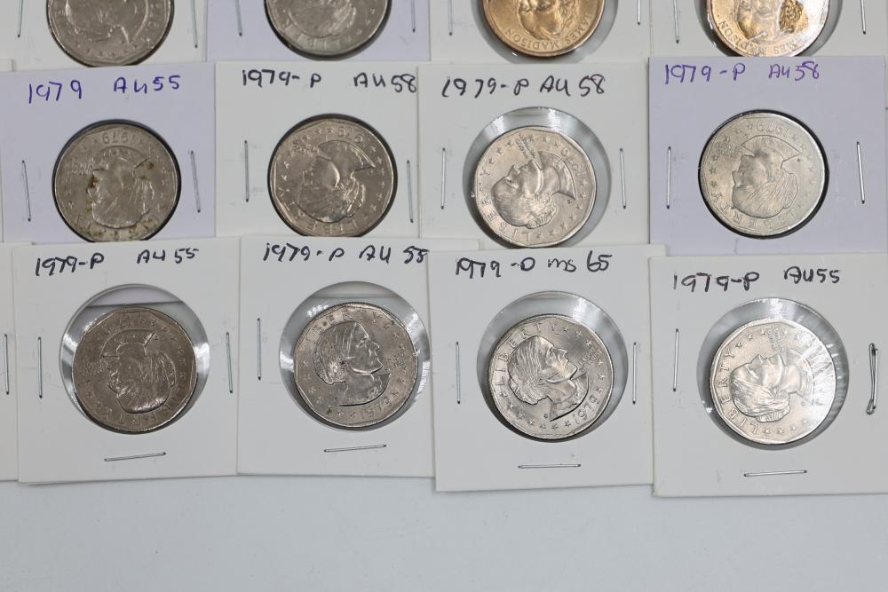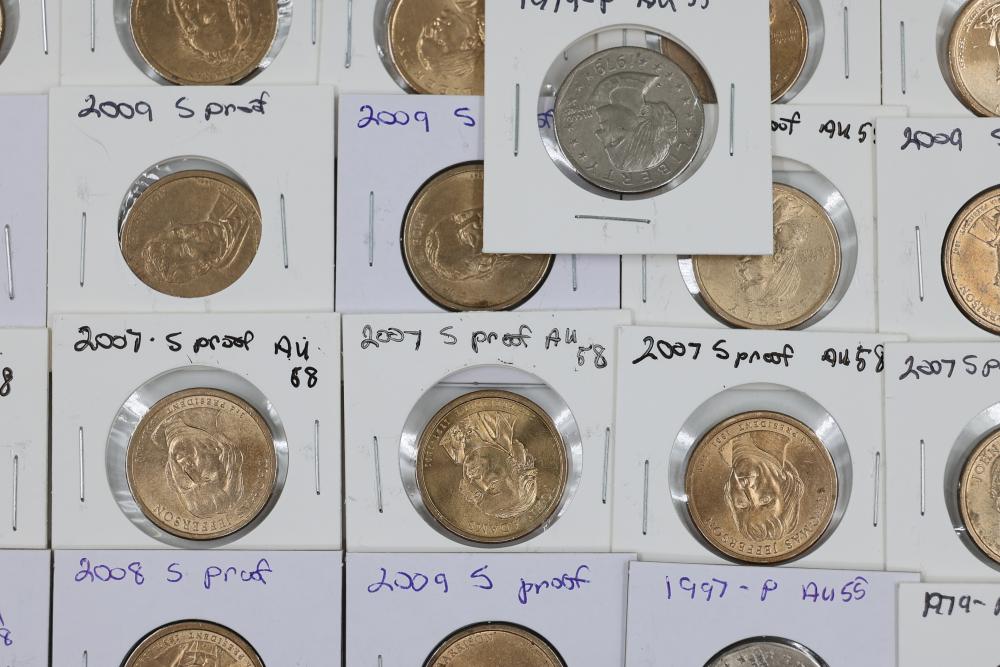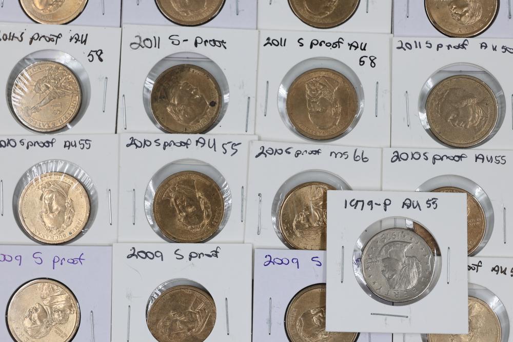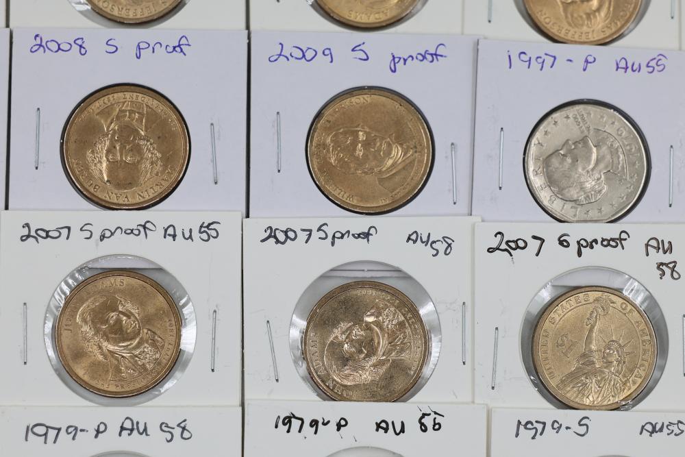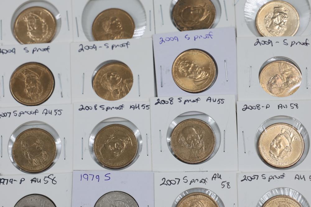 U.S. $1 Commemorative Presidential and SU.S.an B. Anthony Coins from years such as 1979, 2007, 2008, 2009, 2010, and 2011. 90 coins in total.