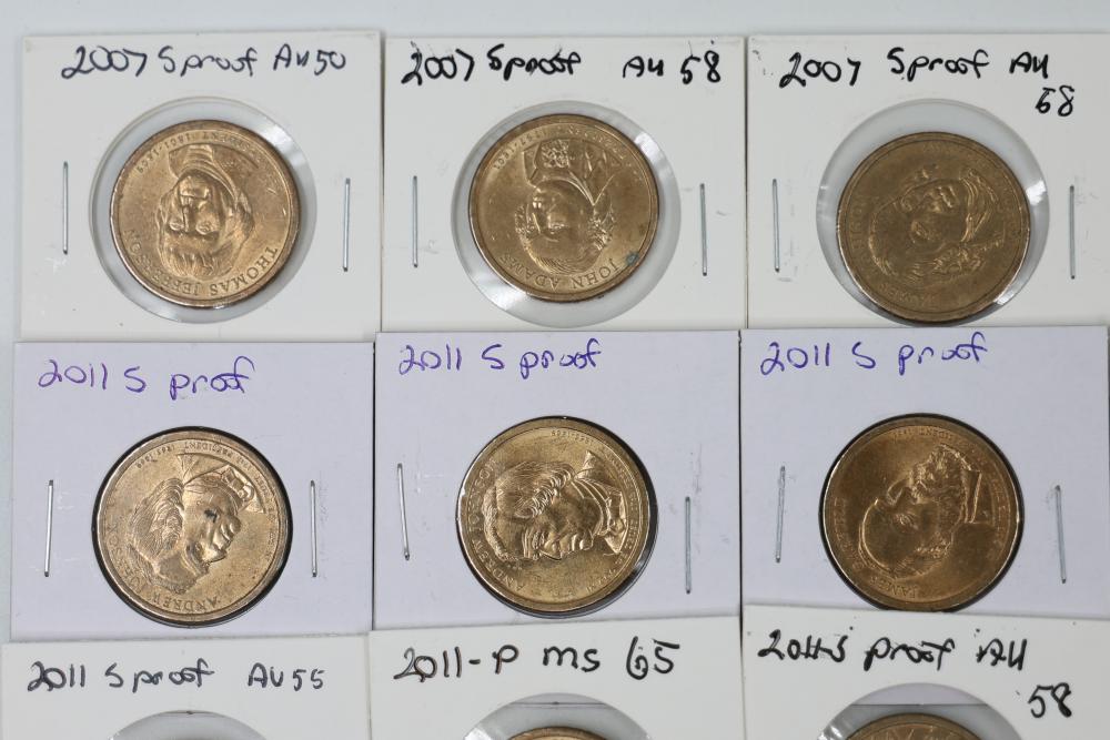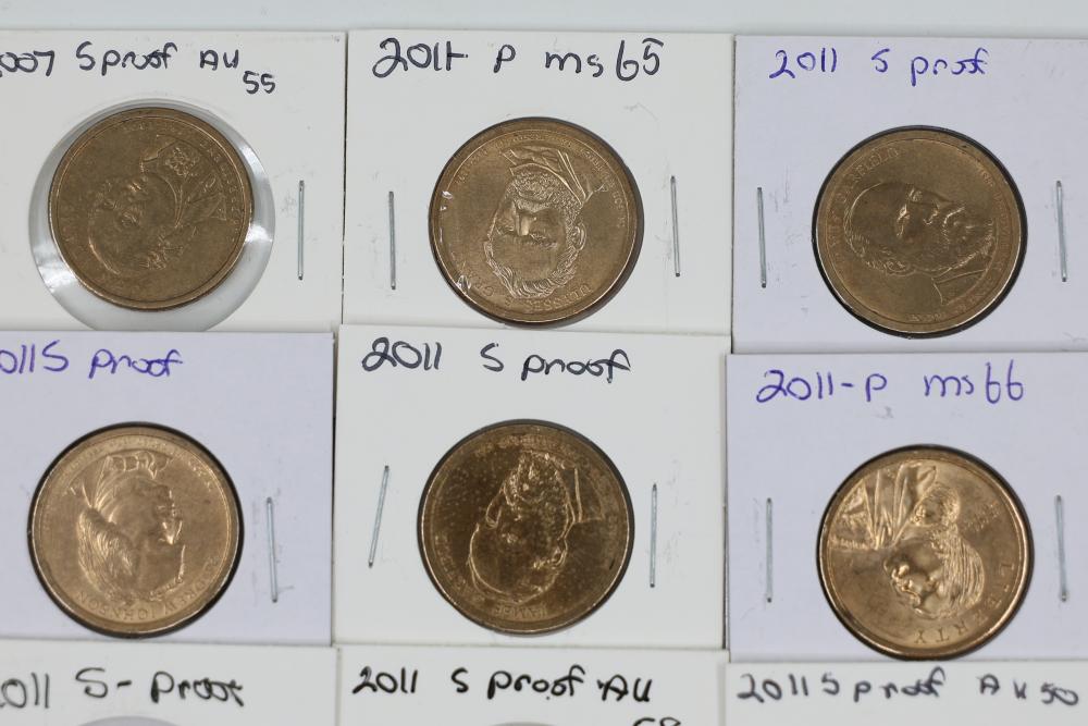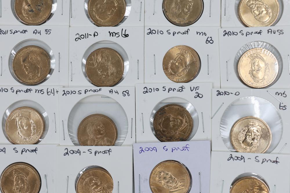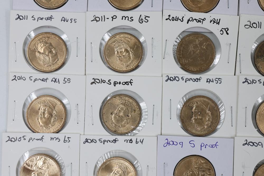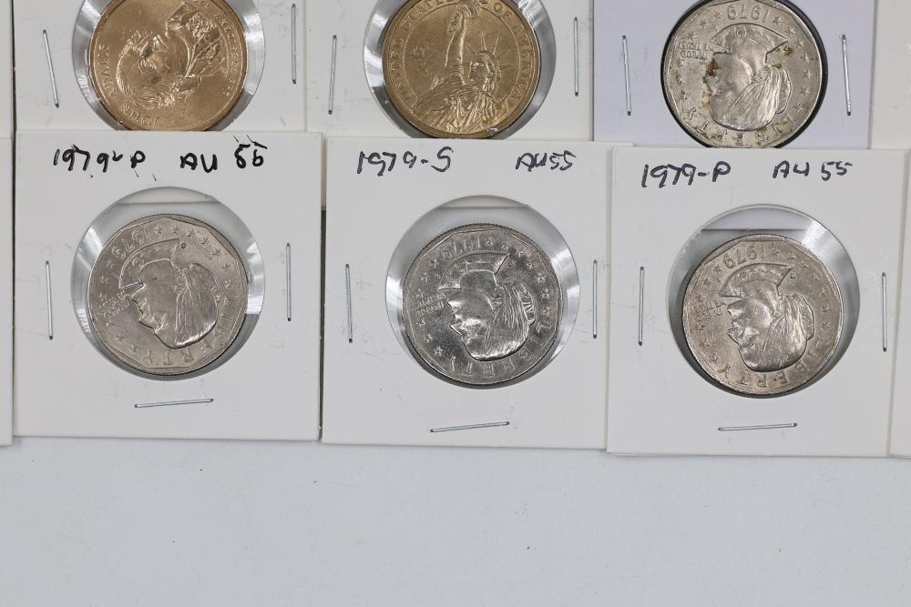 U.S. $1 Commemorative Presidential and SU.S.an B. Anthony Coins from years such as 1979, 2007, 2008, 2009, 2010, and 2011. 90 coins in total.