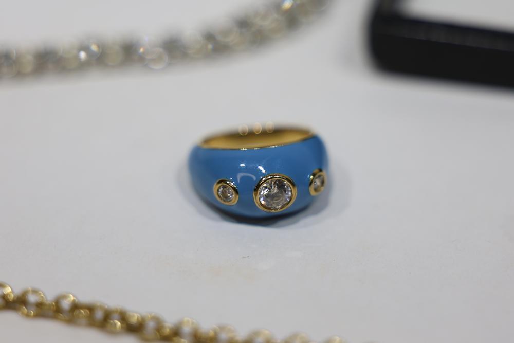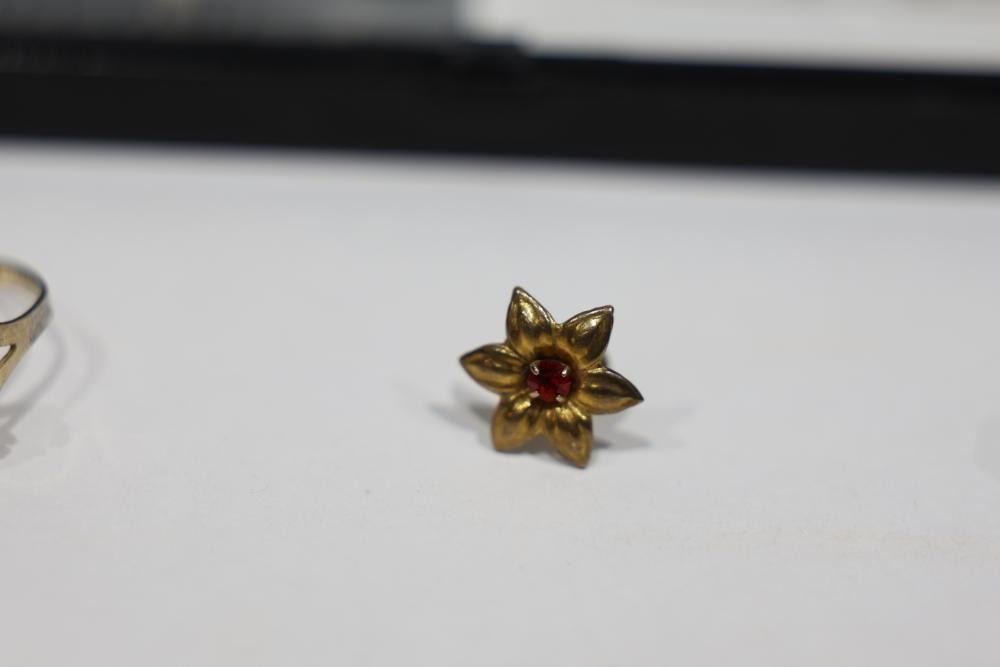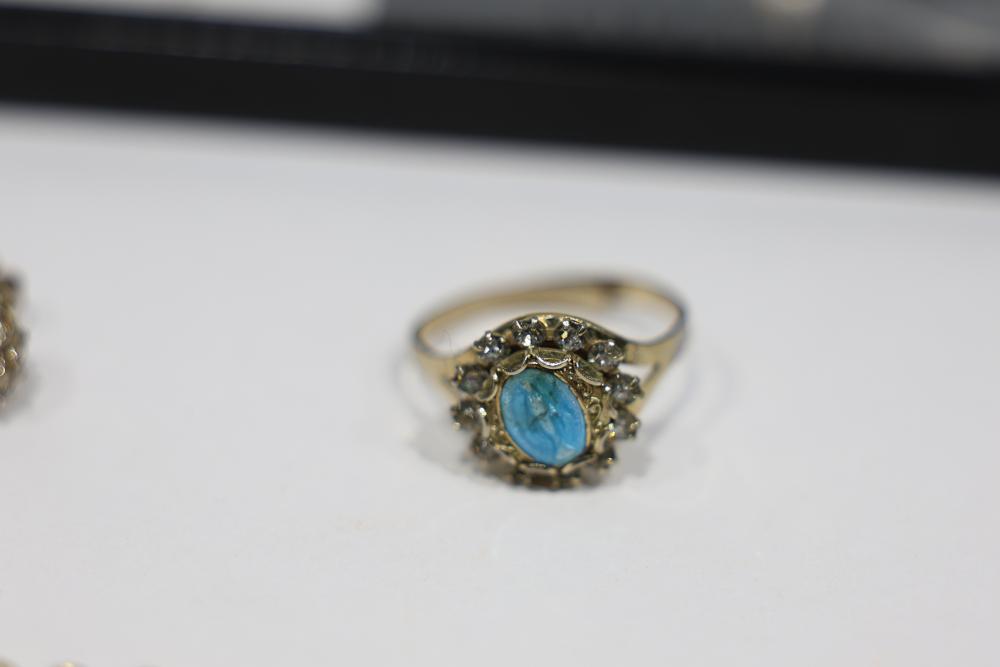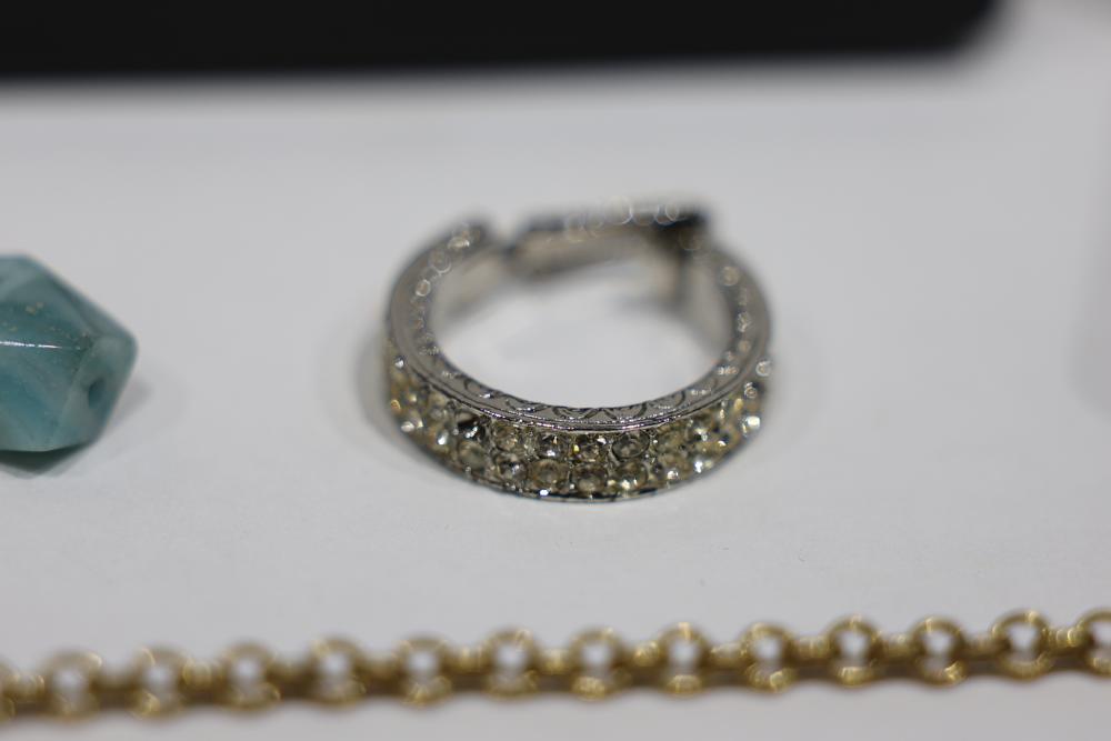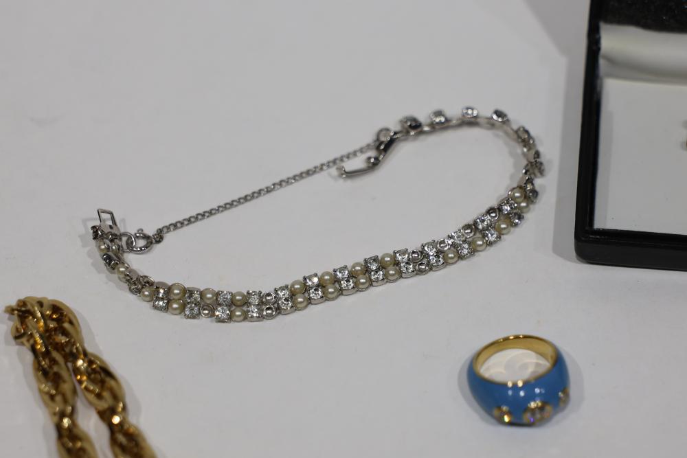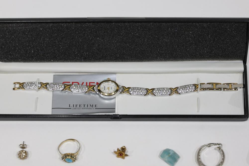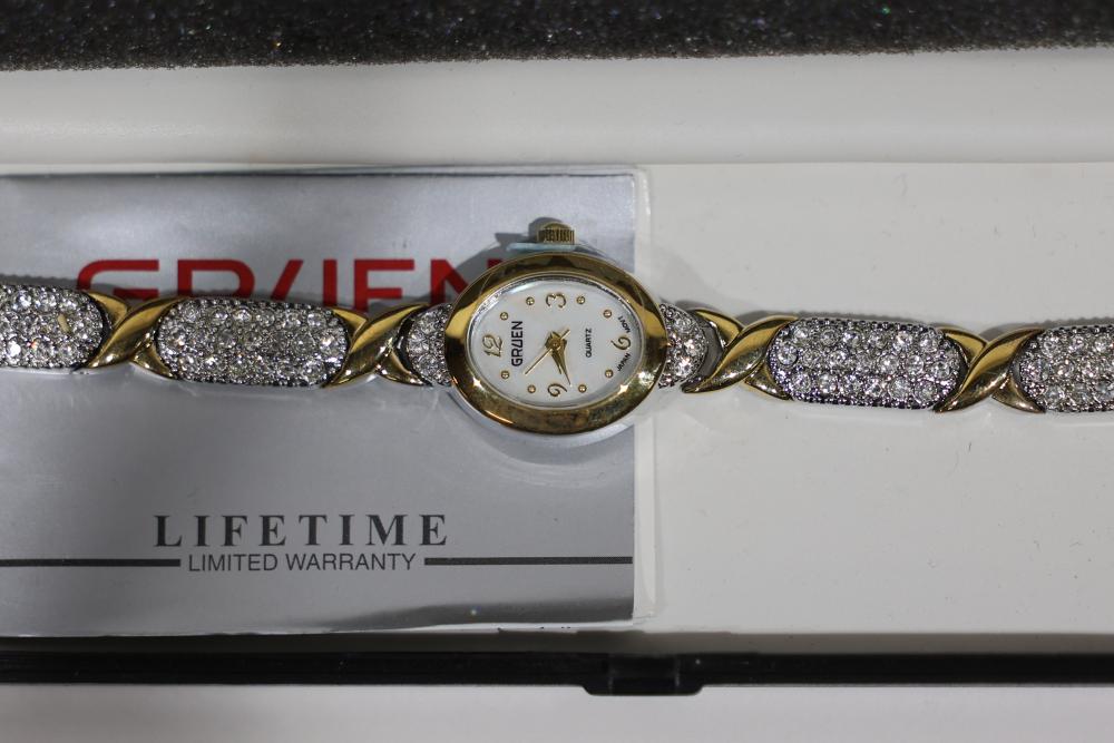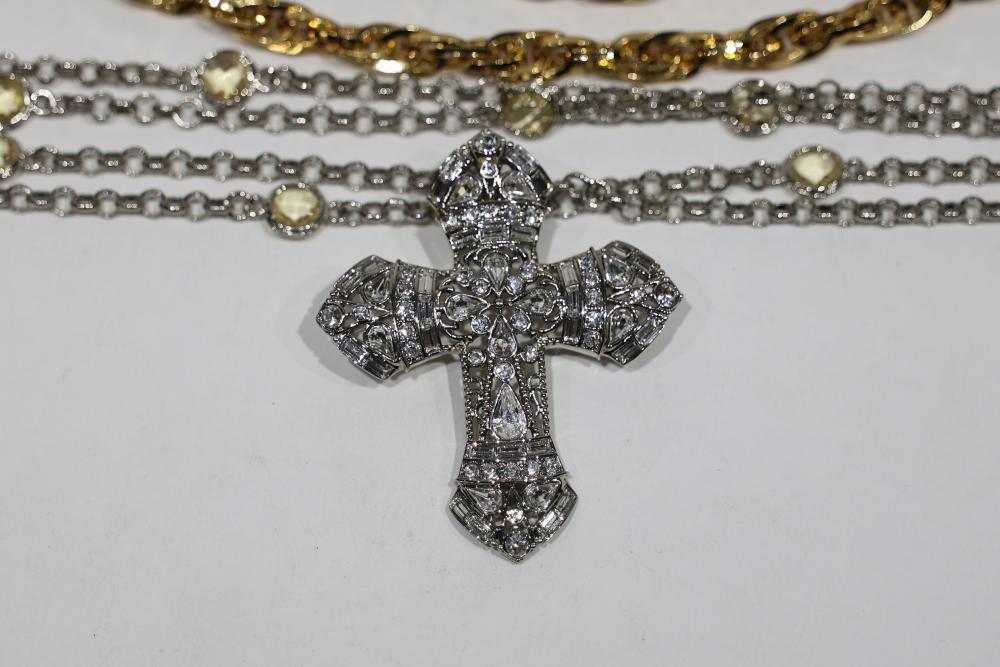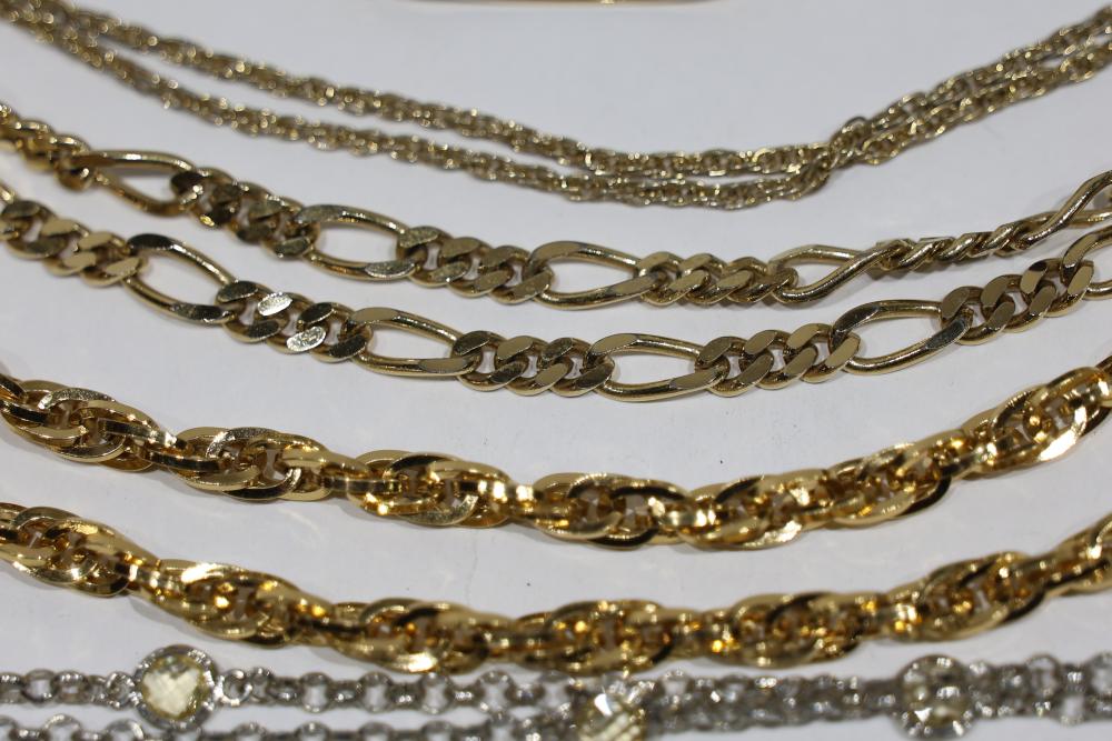 Gold Tone Costume Jewelry Featuring Necklaces, Rings, and Watches. This assortment includes multiple gold tone necklaces, rings with decorative stones, a cross pendant necklace, and two wristwatches, one Stamped 'Gruen.' Includes various bracelet designs and other pieces.