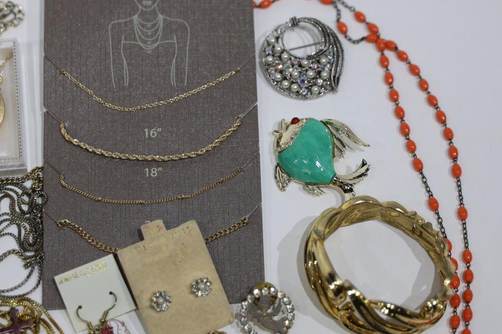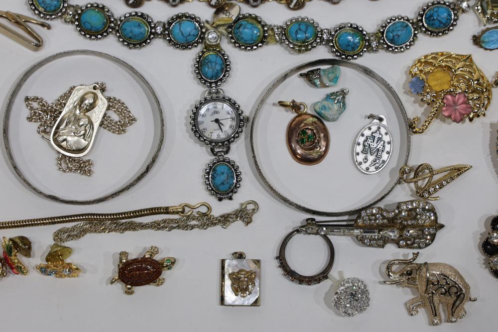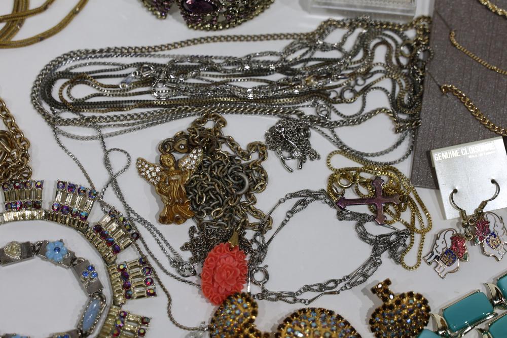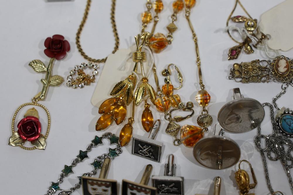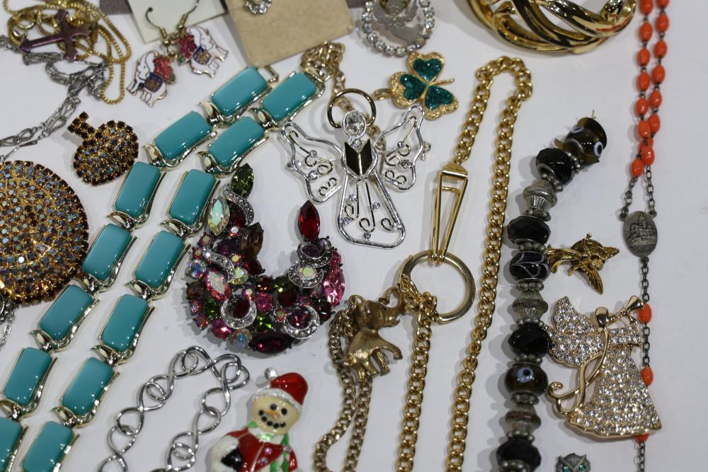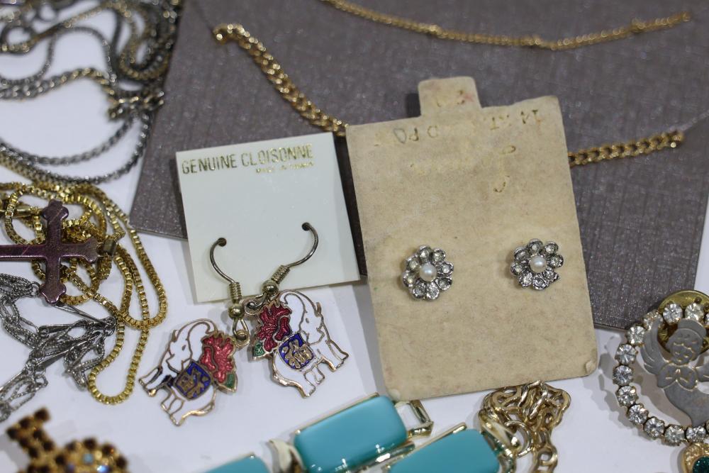 Costume Jewelry Items Including Necklaces, Brooches, Bracelets, and Earrings. Includes a variety of necklaces, bracelets with turquoise accents, intricate brooches, cufflinks, chains, and ornate earrings. Elements such as cameos, animal motifs, religious pendants, and assorted charms are present. Some items are stored in display boxes, while others include tags.