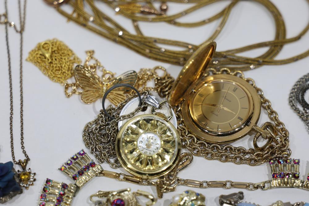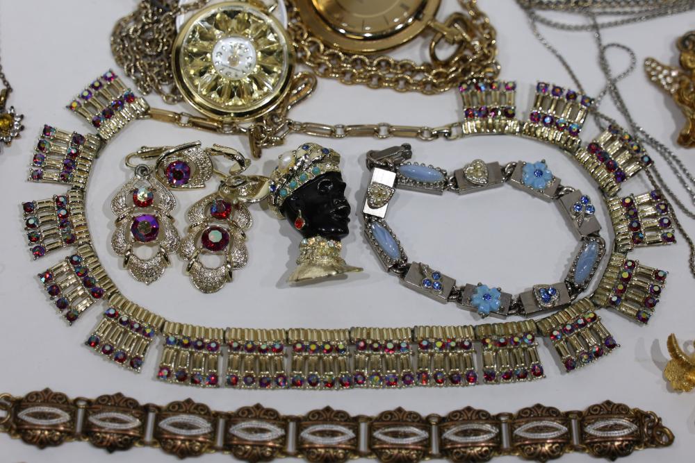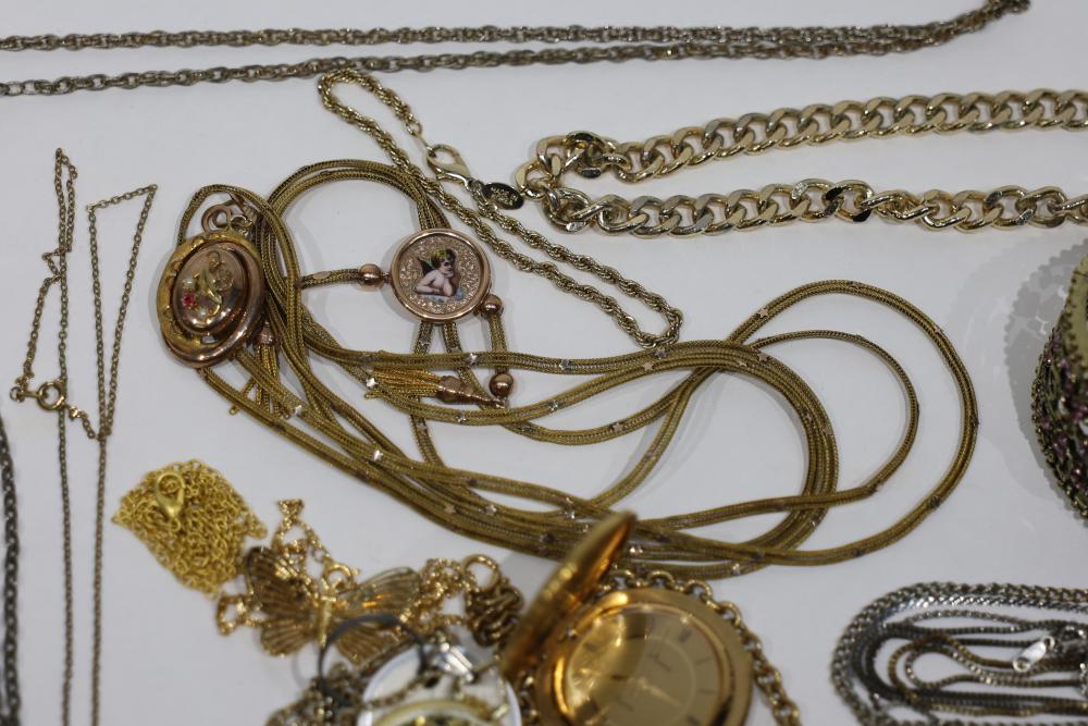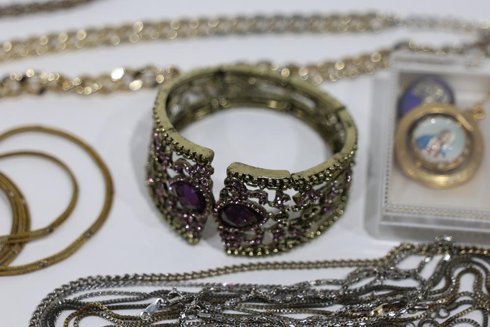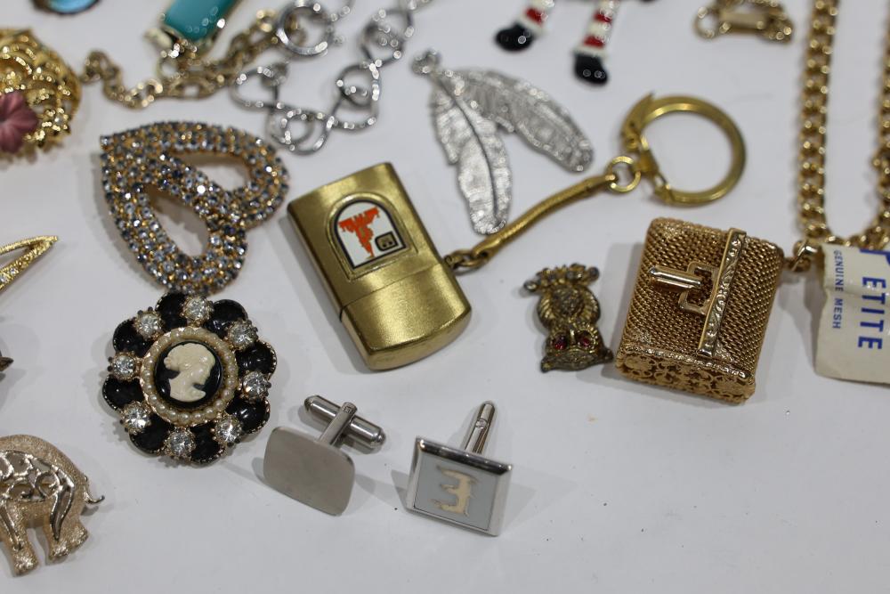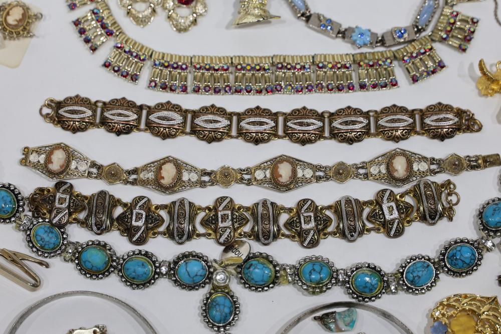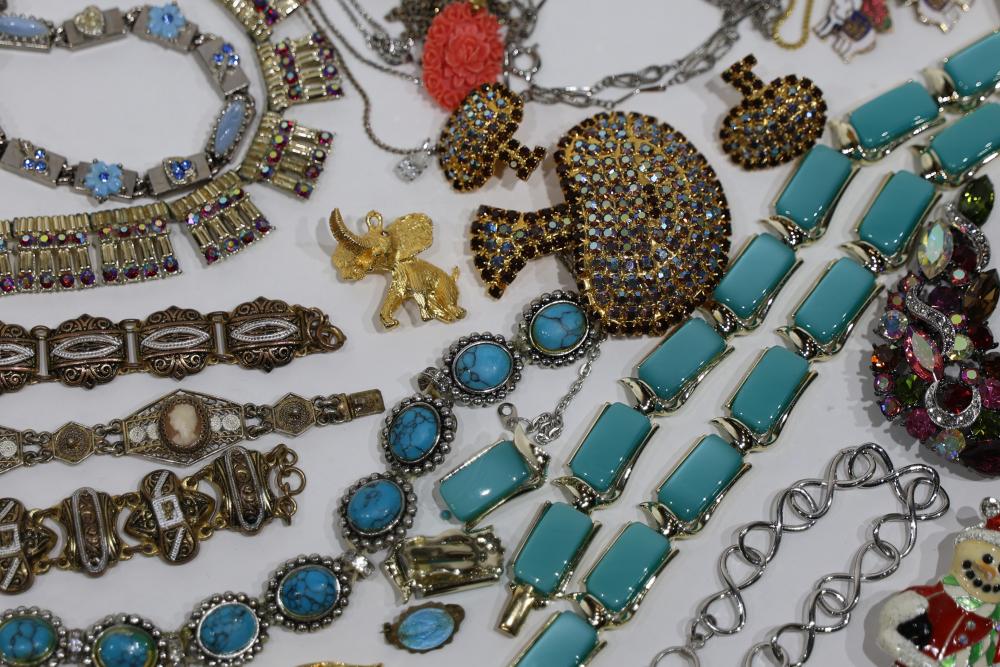 Costume Jewelry Items Including Necklaces, Brooches, Bracelets, and Earrings. Includes a variety of necklaces, bracelets with turquoise accents, intricate brooches, cufflinks, chains, and ornate earrings. Elements such as cameos, animal motifs, religious pendants, and assorted charms are present. Some items are stored in display boxes, while others include tags.