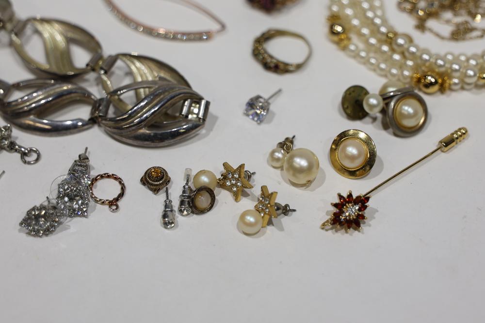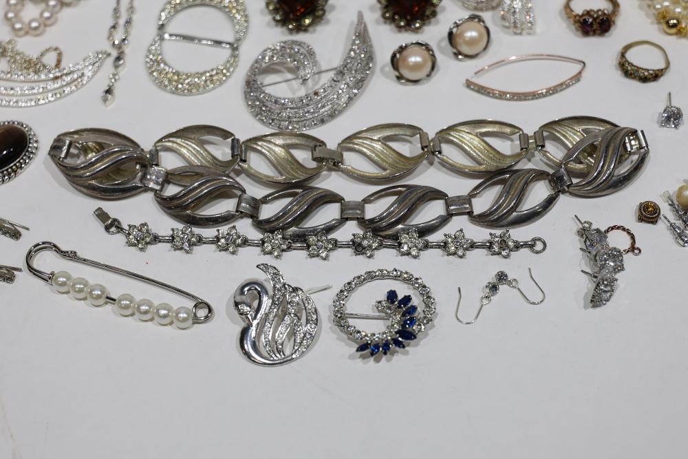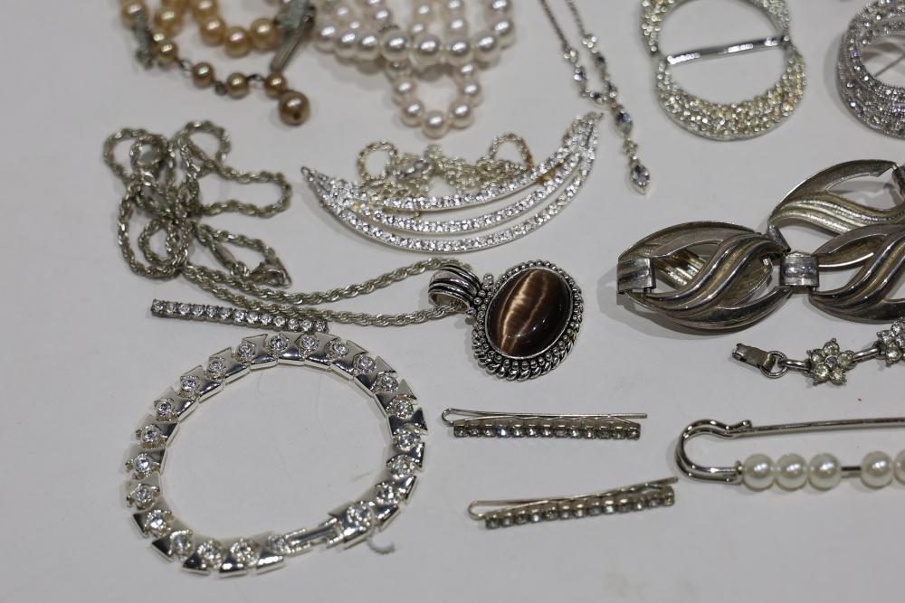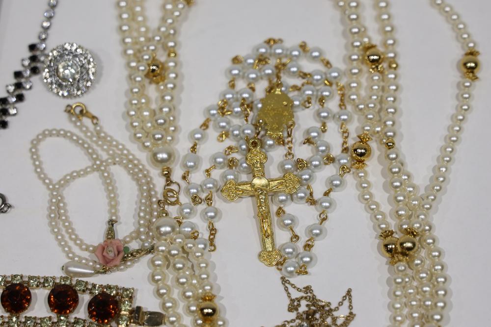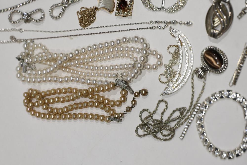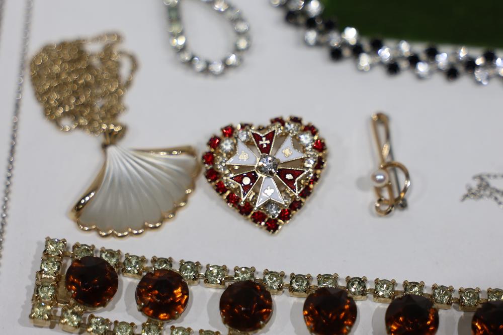 Costume Jewelry Assortment Featuring Necklaces, Bracelets, Earrings, and Brooches. Included are necklaces with faux pearls and pendants, bracelets with rhinestone accents, assorted earrings in stud and drop styles, and brooches with intricate designs. Brands include Sarah Coventry, along with varied vintage-style settings and elements.