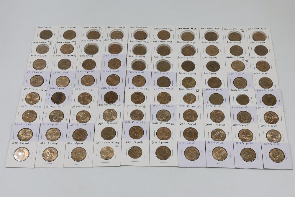 U.S. $1 Commemorative Presidential Dollars from years such as 2009, 2010, and 2011 in variable conditions. 80 coins in total.