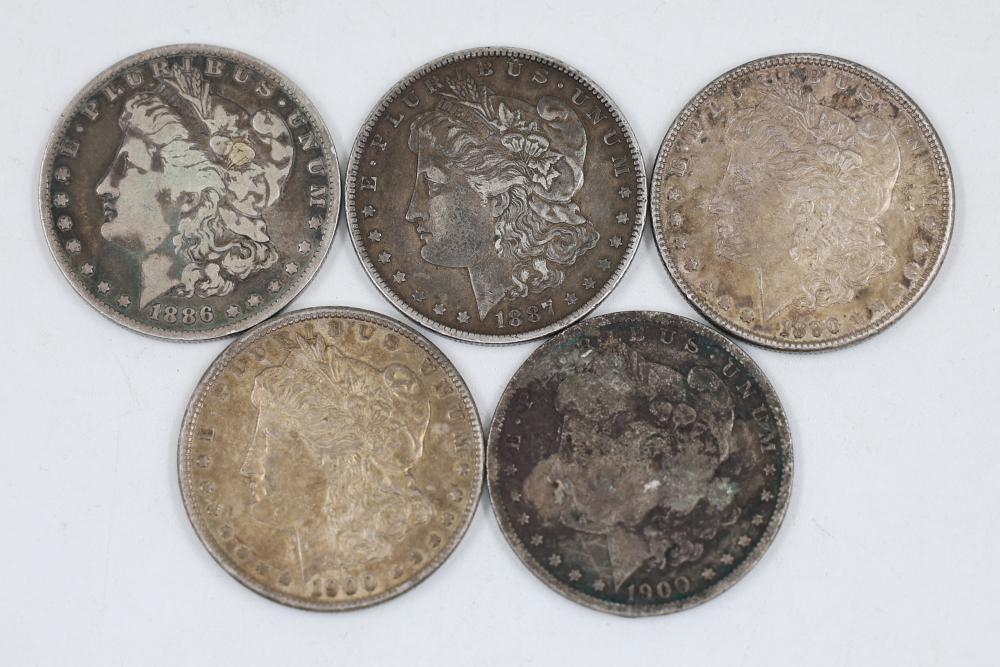 Five Morgan Silver Dollars with Dates Varying from 1886 to 1900. The set includes 1886-O, 1887-O, 1890, and two coins from 1900.