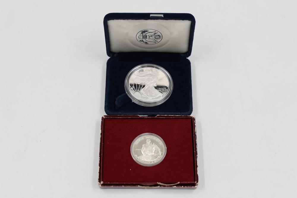 1996 Silver American Eagle One Dollar Proof Coin and George Washington Half Dollar. The American Eagle Proof coin is 1 oz of .999 fine silver.