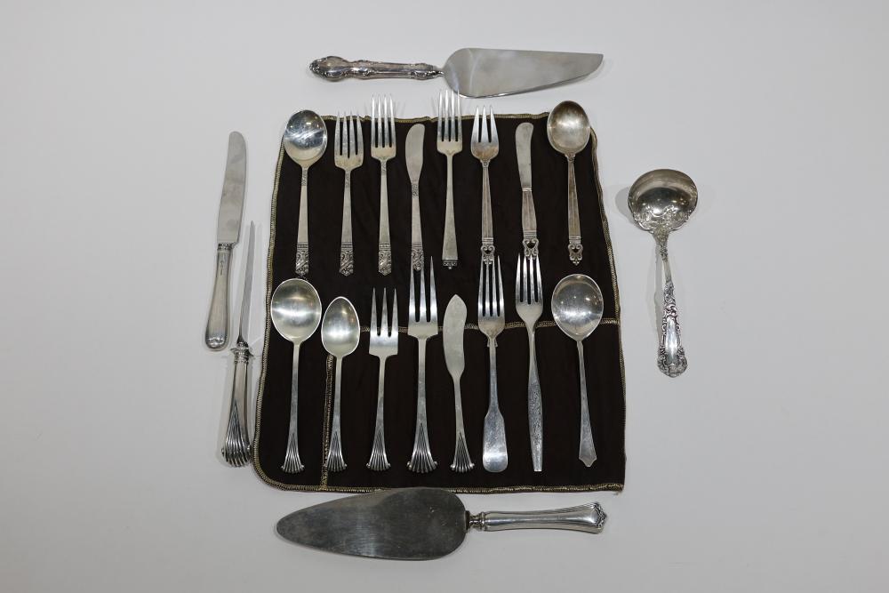 Sterling Silver Flatware and Serving Utensils featuring mixed patterns with items from brands including Heirloom, WM Rogers, and S. Kirk & Son. The collection includes forks, knives, spoons, and serving pieces. Some items display hallmarks and inscriptions. Total weight being 750 grams.