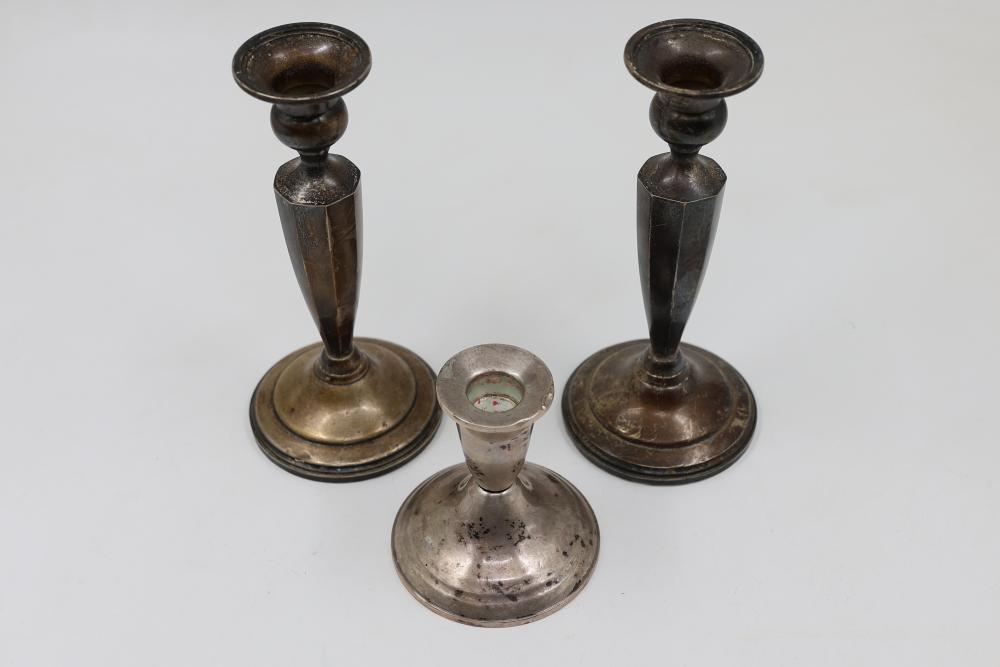 Three Sterling Silver Candlesticks in Assorted Styles. Includes two matching candlesticks with an octagonal faceted design and one smaller candlestick with a smooth finish. Each is constructed of sterling silver with reinforced bases as Stamped. Total weight being 946 grams.