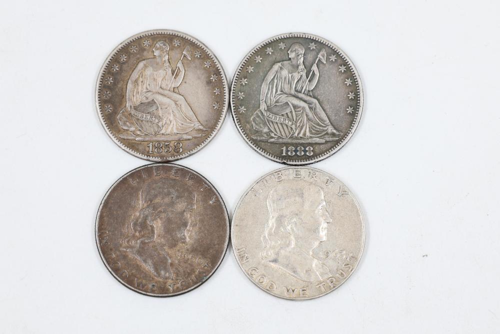 Four U.S. Half Dollars consisting of an 1858 Sitting Liberty O, 1888 Sitting Liberty, 1950 Benjamin, and 1965 Benjamin D Half Dollar.