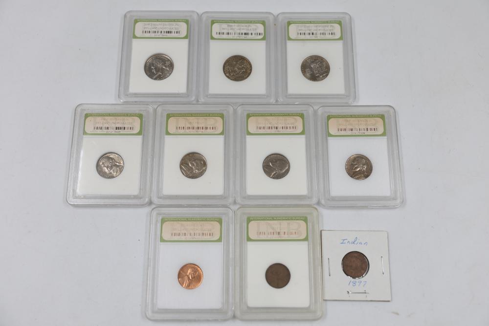 U.S. INB slabbed and graded coins incl 2000-D New Hampshire 25c , 2006- South Dakota 25c, 1954-P Jefferson 5c, 1958-D Jefferson 5c, 1970-S Jefferson 5c, 1959-P Lincoln 1c, 1954-S San Franciso Wheat Cent, and a 1897 Indian Head 1c.