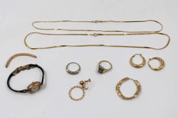 14k and 10k Stamped Gold Jewlery with Chains, Earrings, Rings, and Watch. Includes chains, hoop earrings, a bracelet, a Benrus watch, and multiple rings with various designs. Total weight being 13 grams.
