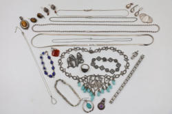 Sterling Silver and Gemstone Jewelry. Includes necklaces, bracelets, earrings, and pendants, featuring designs crafted in sterling silver, gemstones, and marcasite accents. Markings indicate 925 sterling silver and some makers. Sterling weight is 48 grams, total weight being 239 grams.