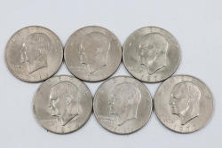 Six Eisenhower One Dollar Coins featuring dates 1971, 1974, and bicentennial year 1976.