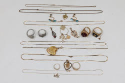 Gold and Silver Jewelry including multiple gold chains, rings featuring gemstones, gold lockets, and earrings with blue accents. Various items are Stamped as 10K and 14K gold. Gold weight is 20 grams. Total weight being 55 grams.
