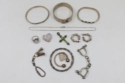 Sterling Silver Jewelry including bracelets, rings, a heart-shaped pin, a cross pendant with green stones, hoop earrings, and other decorative accessories. Some items stamped with 925. Sterling weight is 212 grams. Total weight is 234 grams.