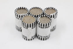 Five Rolls of Kennedy Half Dollars. Each roll contains $10 face value of coins. Coins feature classic Kennedy design on obverse and presidential seal on reverse.
