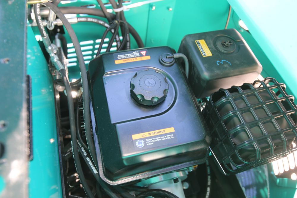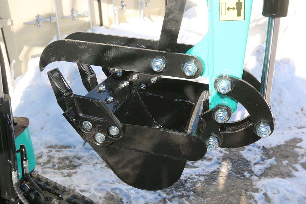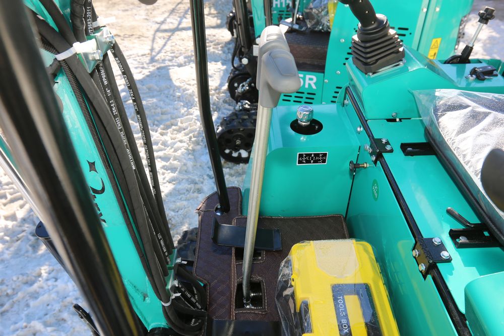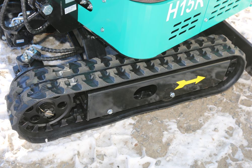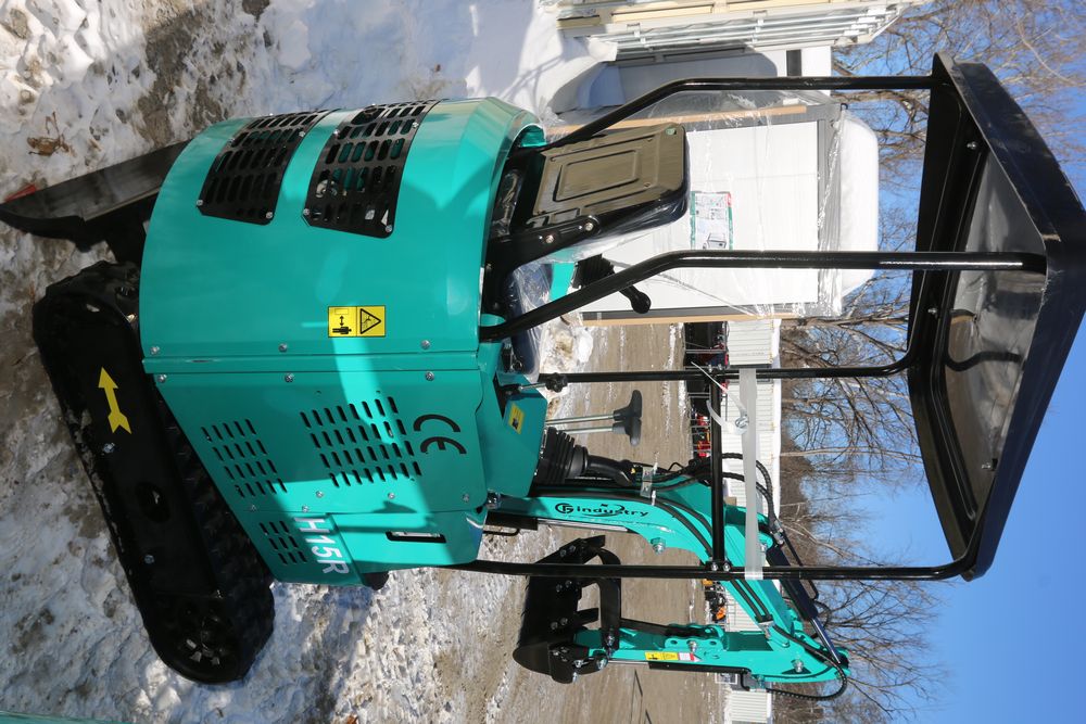 New 2026 CFG Industrial gas powered mini Excavator model H15R with 420cc gasoline engine, bucket, 4' long tracks, 38.5" wide base, 6" wide tracks, canopy, hydraulic boom & bucket controls, pilot system, thumb, dozer blade. Hours reading less than 1 hour.