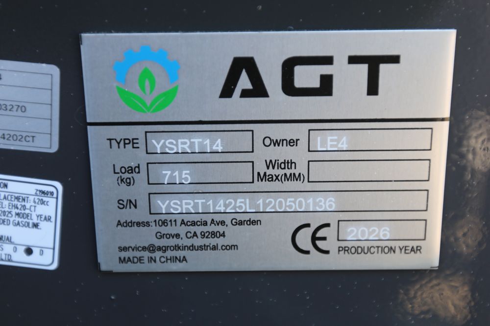 New 2026 AGT mini Skid Steer loader model YSRT14 with 420CC engine, hand controls and front facing light, and hydraulic hook ups. Hours reading less than one hour.