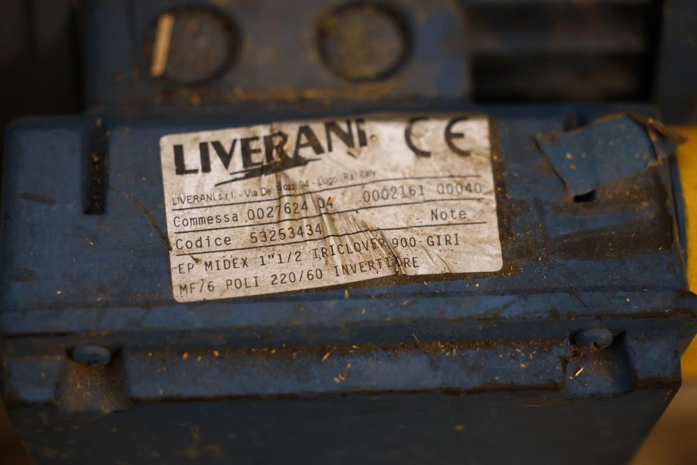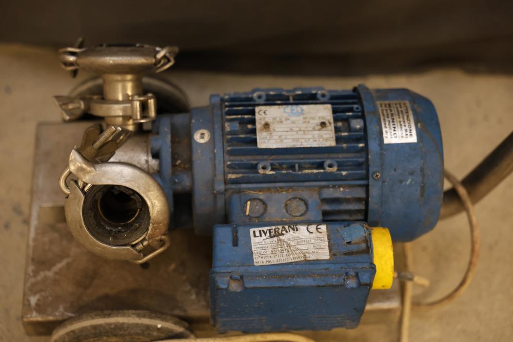 Liverani 1 HP 230 Volt .75 W Centrifugal Pump mounted on a portable cart with wheels and handle. Includes visible wiring, stainless steel connections, and motor components. Shows signs of use and wear. Pickup only.