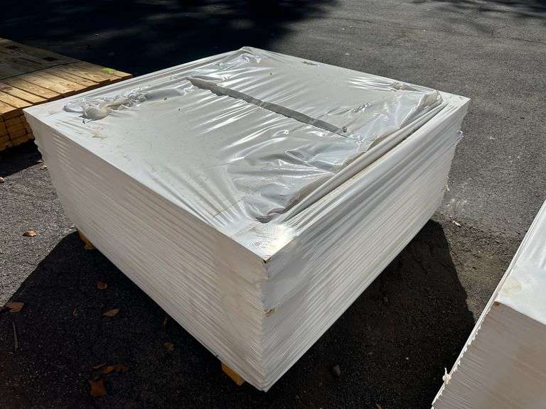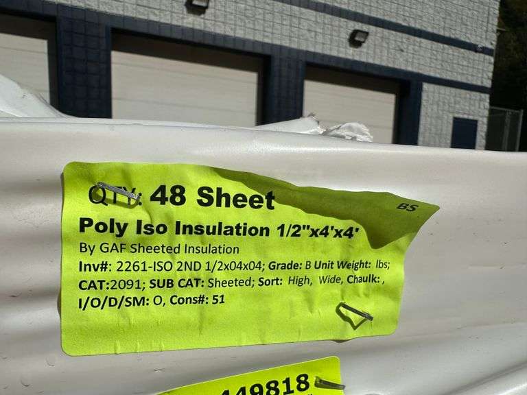 GAF Sheeted Insulation Brand Poly Iso Insulation, measuring 1/2 inch by 4 feet by 4 feet. Includes 48 sheets per unit as indicated on the label. The insulation material is wrapped in protective covering, though some tearing in the wrap is evident, exposing the material beneath. Offered as-is and suitable for insulation applications. Pickup only.