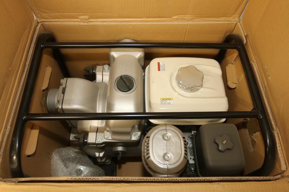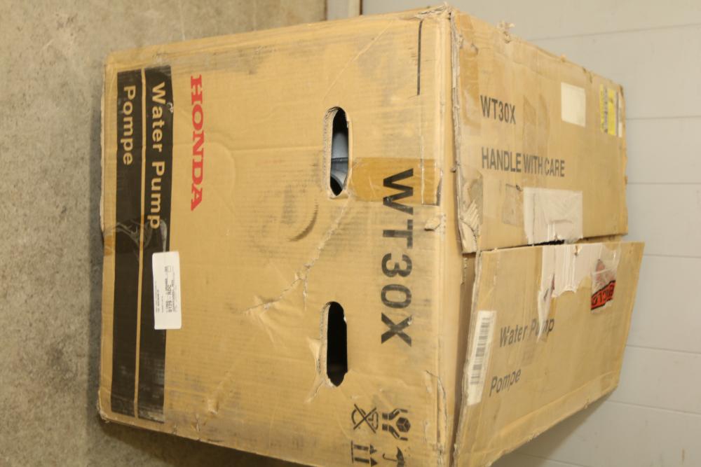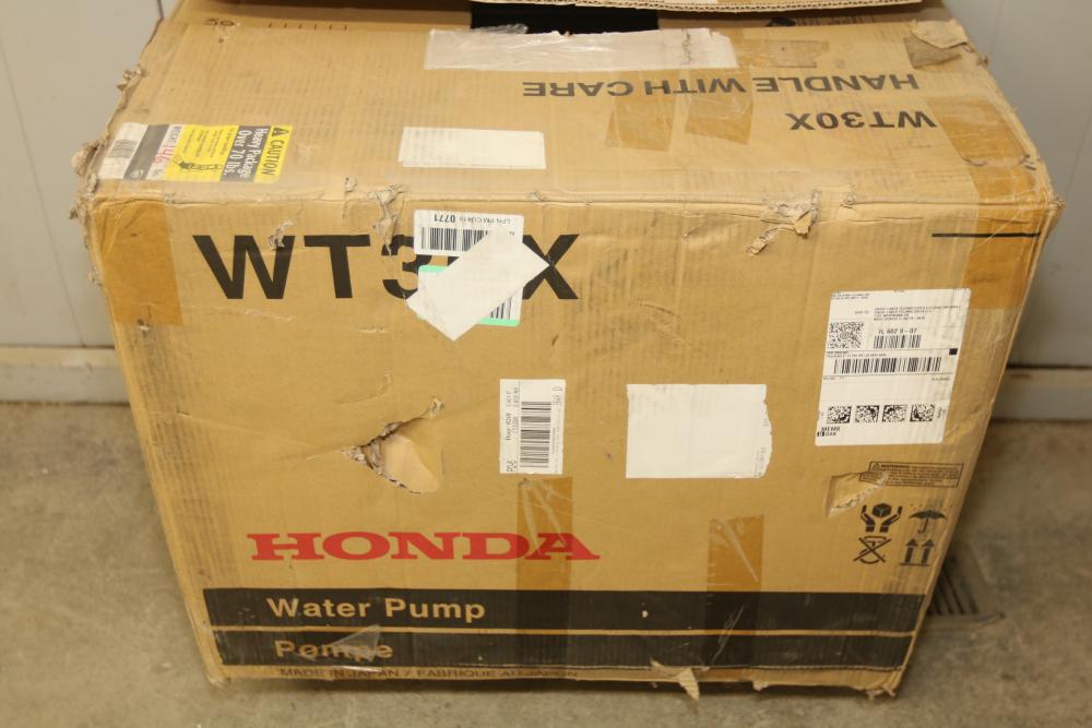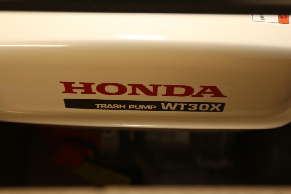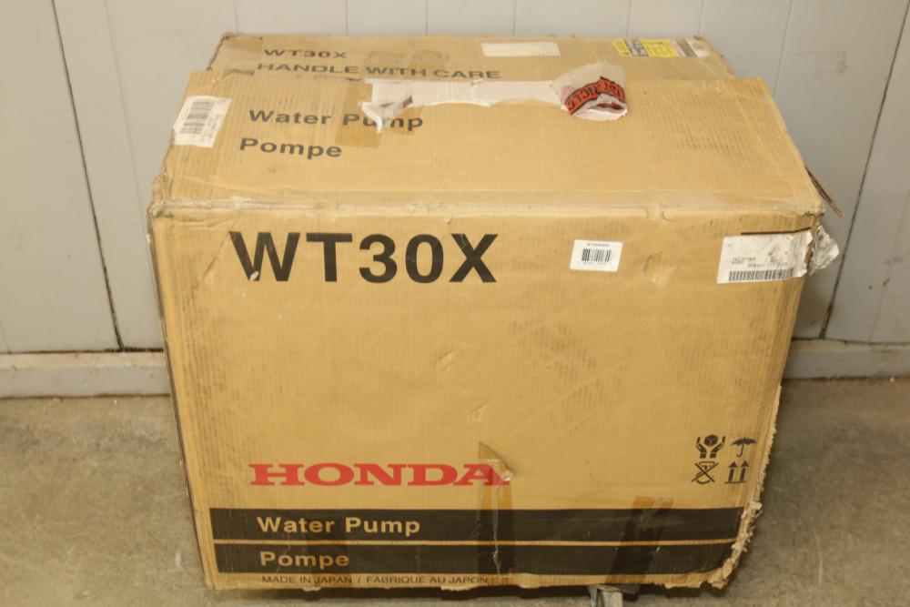 Honda WT30X 3 Inch Trash Pump with a 317 gallon per minute capacity, solid handling capability up to 11/16ths of an inch, and durable cast iron volute and impeller. Includes a quick clean-out port for maintenance efficiency. Model WT30XK4A. Item appears in original box with included owner's manual. Pickup only.
