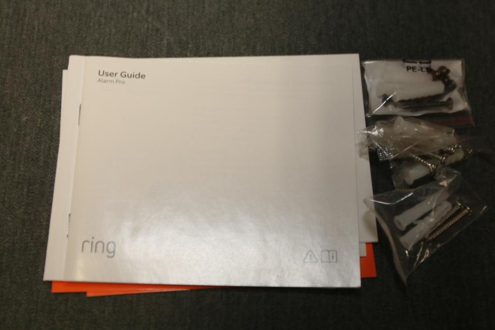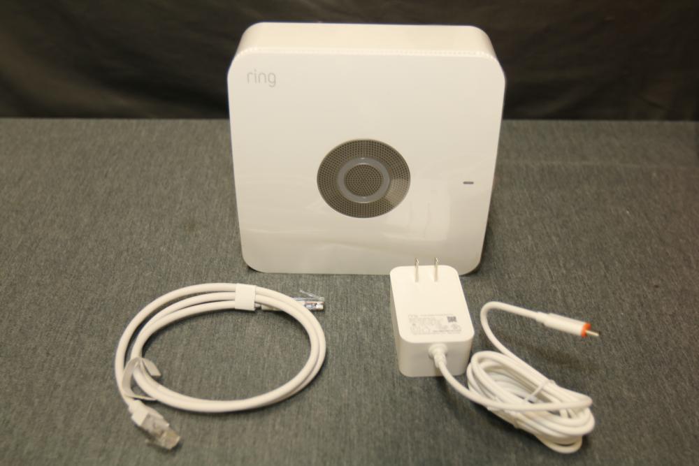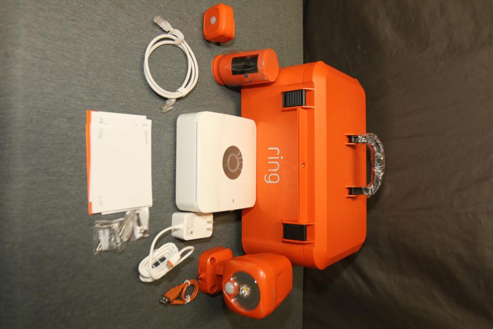 Ring Jobsite Security 5-Piece Starter Kit (Model B08S2Z5XK5). Includes an Alarm Pro Base Station, Spotlight Battery, Stick Up Cam Battery, Motion Sensor, and a Powered Case for storage and protection. The kit also features accessories such as cables, mounting hardware, and a user guide. Pickup only.
