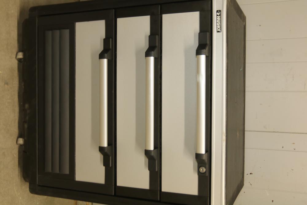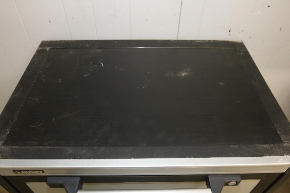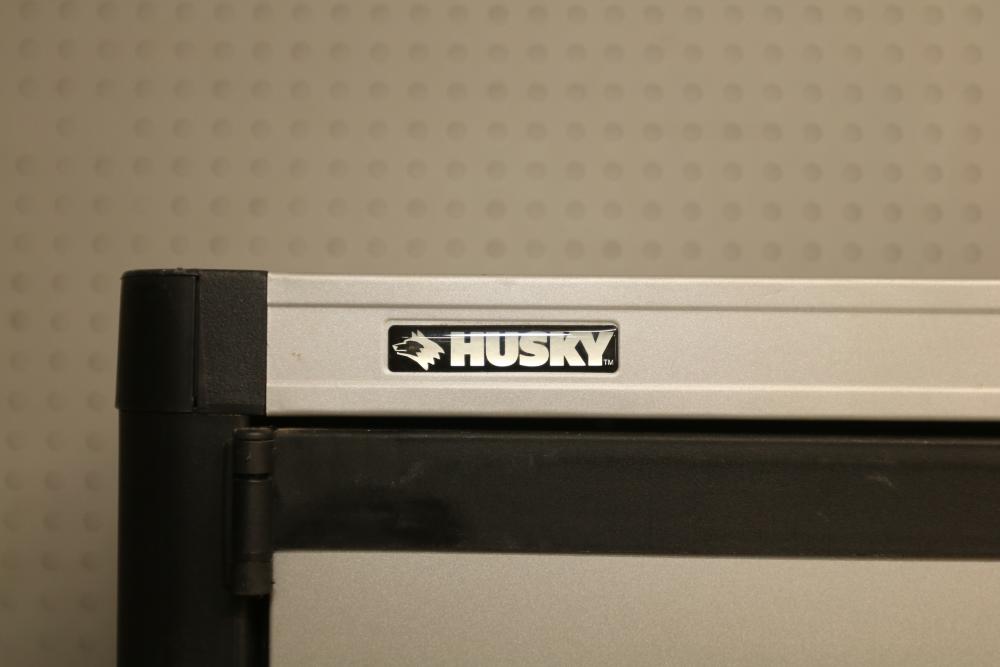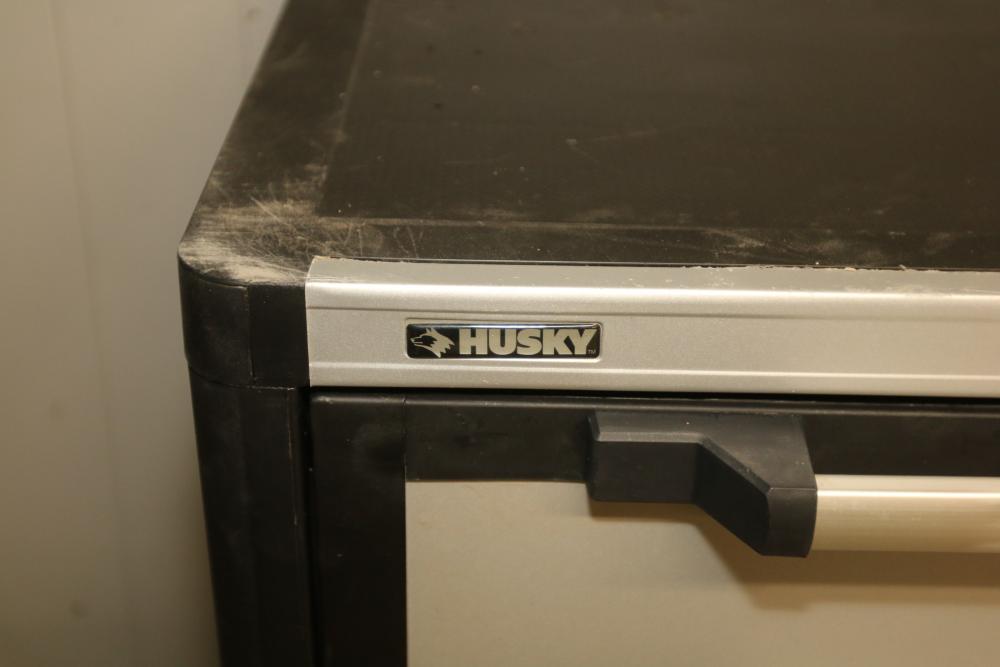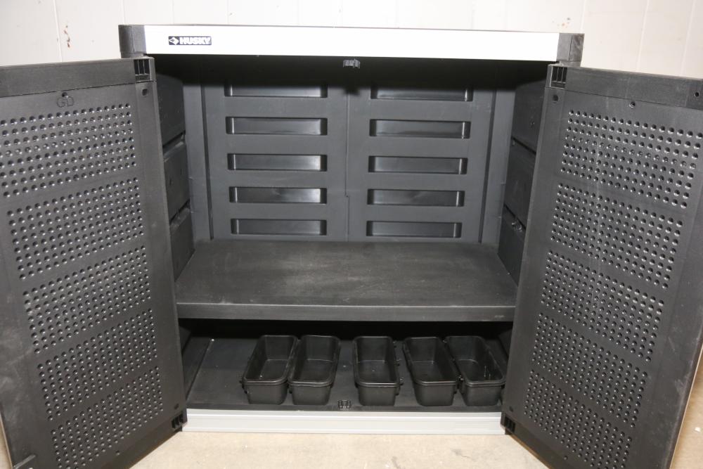 Husky 2-Drawer 29 inch wide Garage Storage Cabinet with 5 hanging bins and adjustable shelves, and Husky 3-Drawer 29 inch wide Garage Storage Cabinet with 4 legs. One leg on the 3-drawer cabinet is broken and requires repair, and the key for the 3-drawer cabinet is not included.