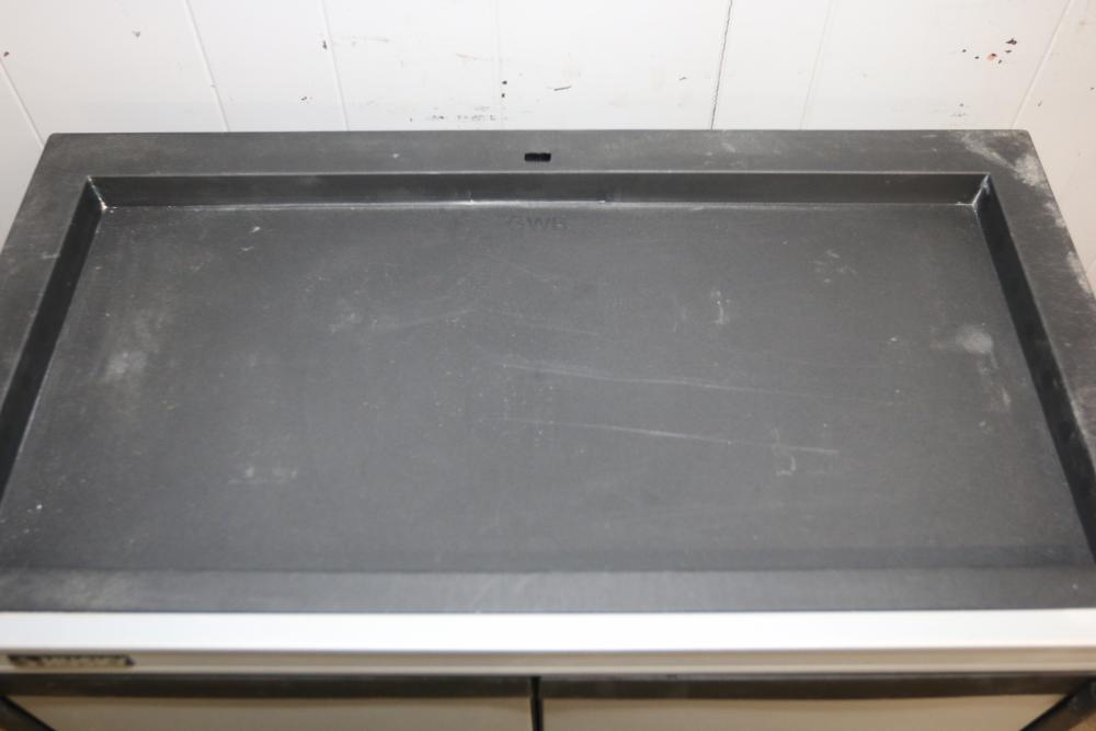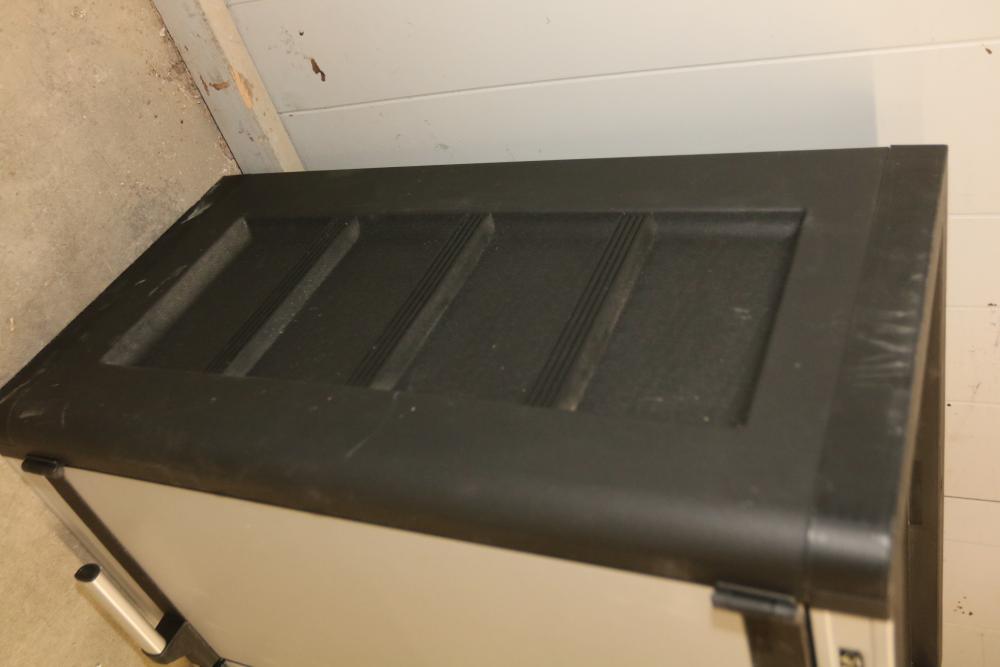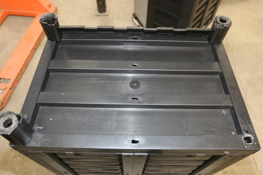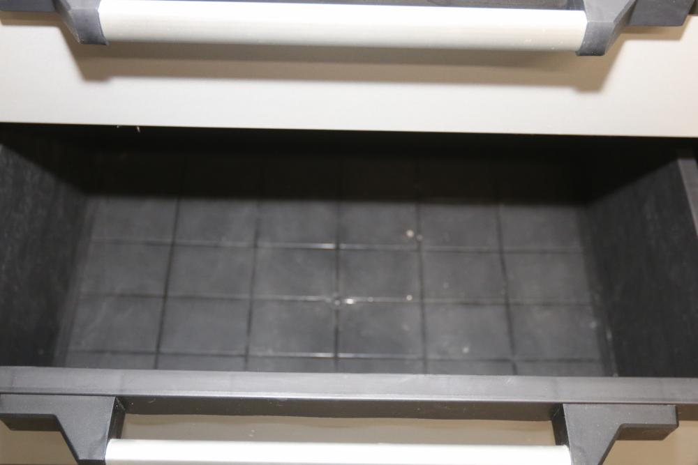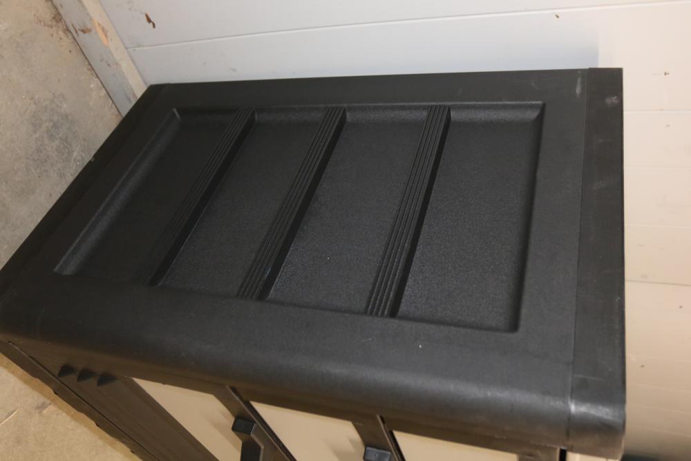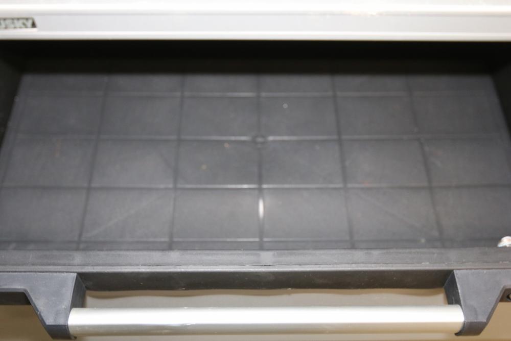 Husky 2-Drawer 29 inch wide Garage Storage Cabinet with 5 hanging bins and adjustable shelves, and Husky 3-Drawer 29 inch wide Garage Storage Cabinet with 4 legs. One leg on the 3-drawer cabinet is broken and requires repair, and the key for the 3-drawer cabinet is not included.