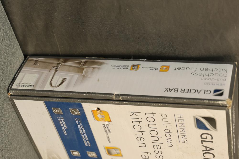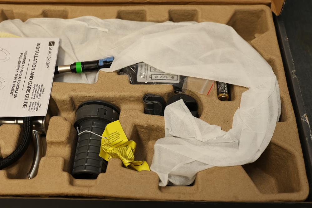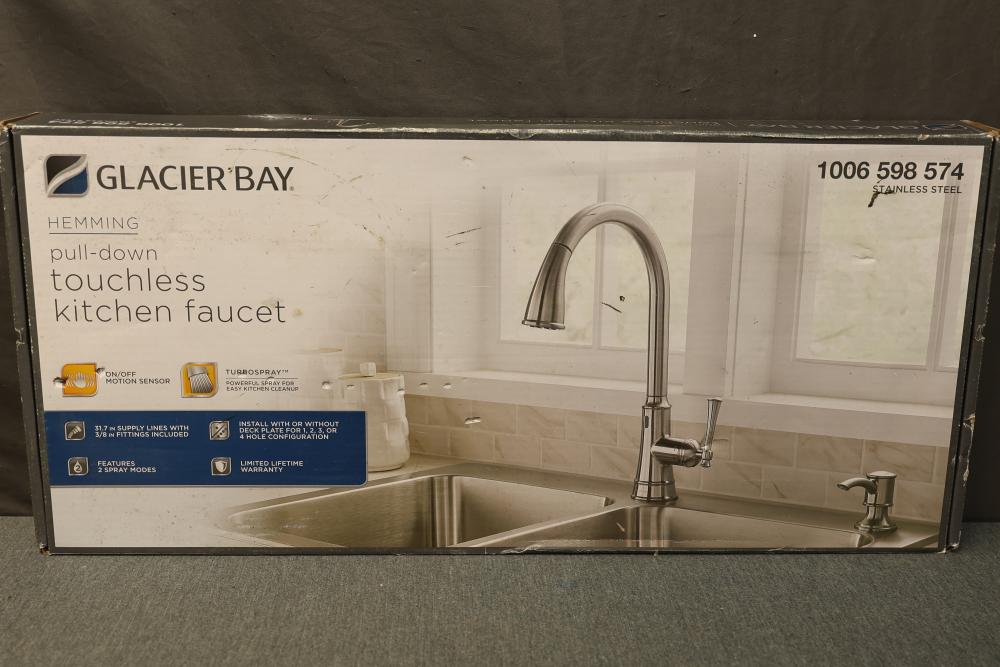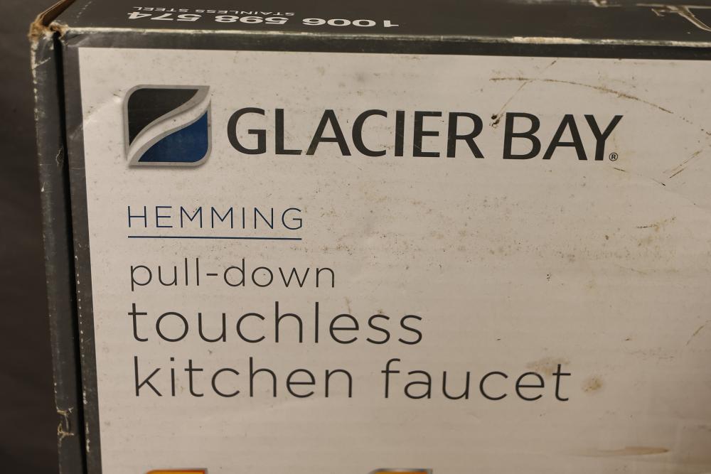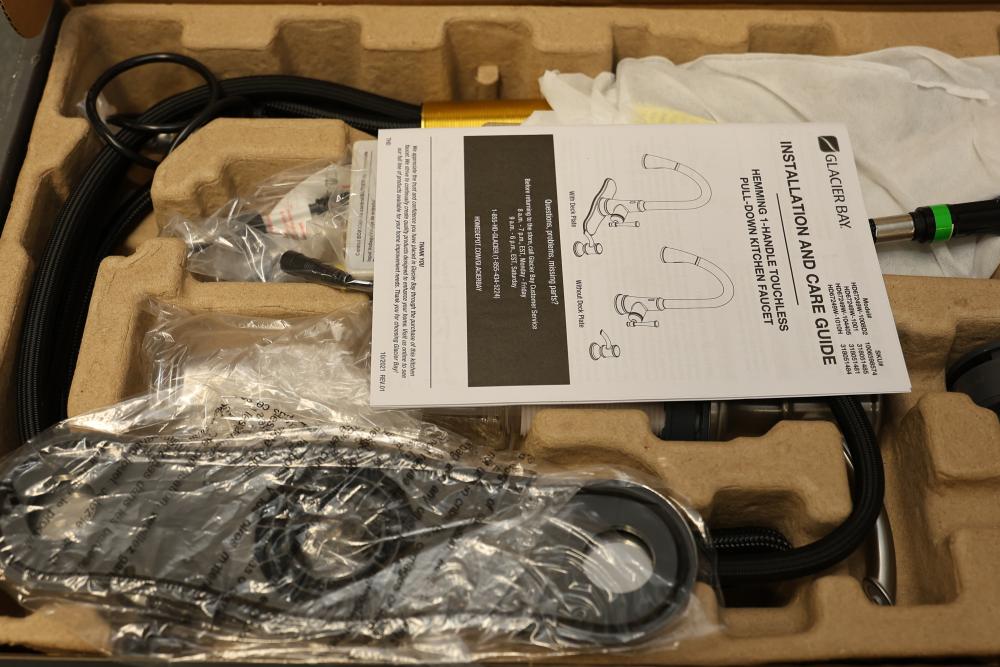 Glacier Bay Hemming Single-Handle Touchless Pull Down Sprayer Kitchen Faucet with Soap Dispenser in Stainless Steel (Model HD67249W-1008D2). Includes installation and care guide, necessary supply lines, and mounting hardware. Features a touchless design with ON/OFF motion sensor. Pickup only.