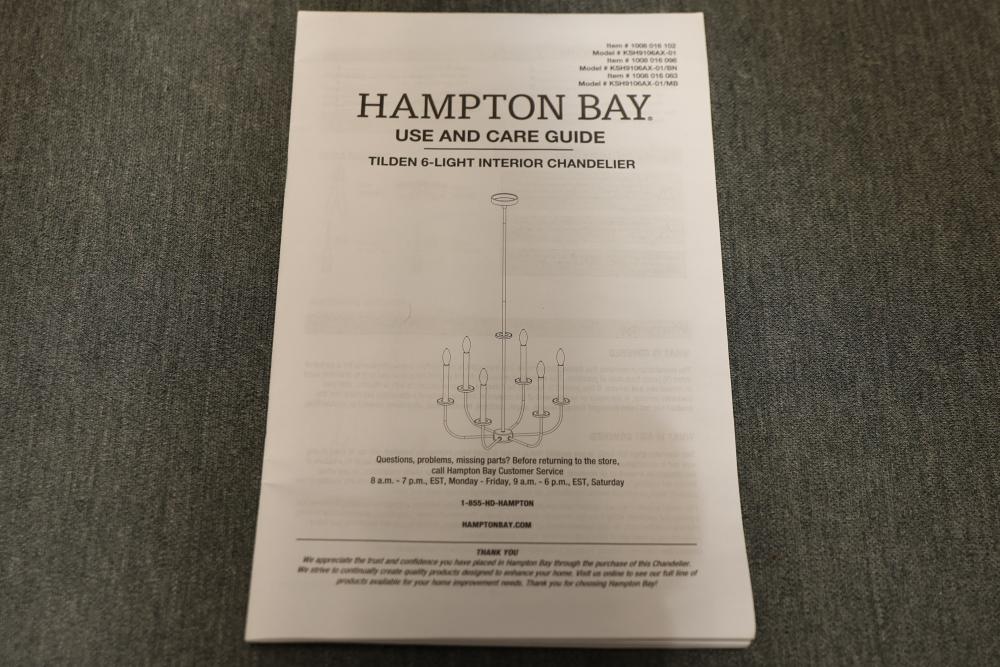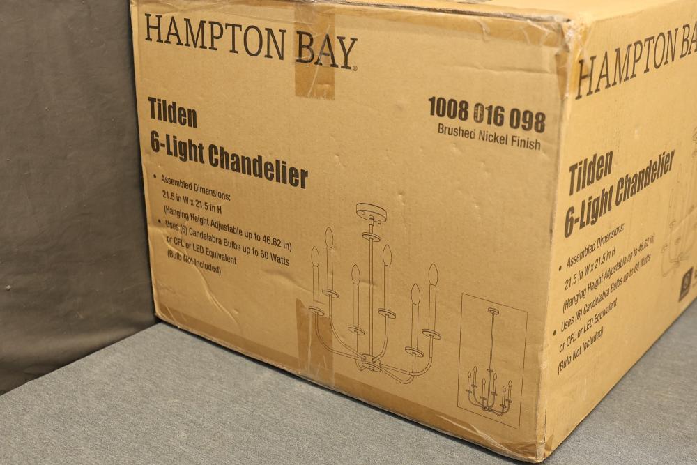 Hampton Bay Tilden 6-Light Brushed Nickel Chandelier (Model KSH9106AX-01/BN). Features a brushed nickel finish and accommodates (6) candelabra bulbs up to 60 watts each or CFL/LED equivalents. Assembled dimensions are 21.5 in W x 21.5 in H with an adjustable hanging height up to 46.62 in. Light bulbs are not included. Pickup only.
