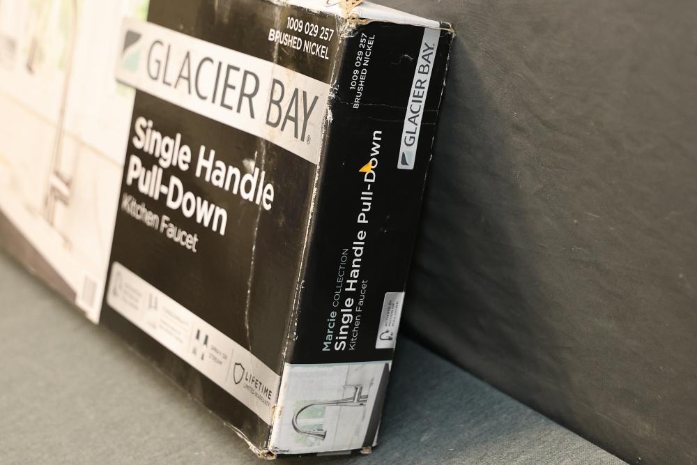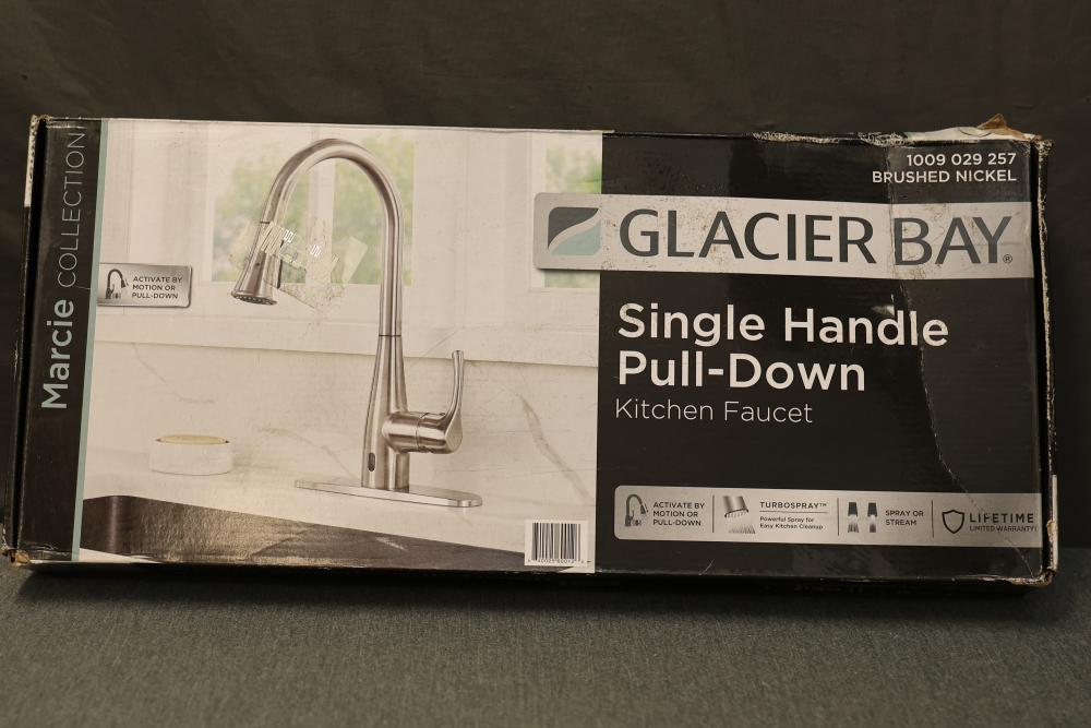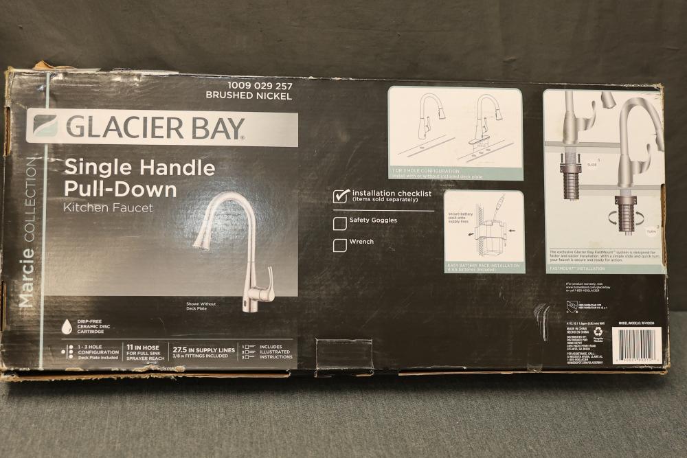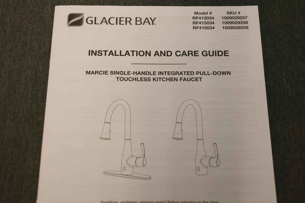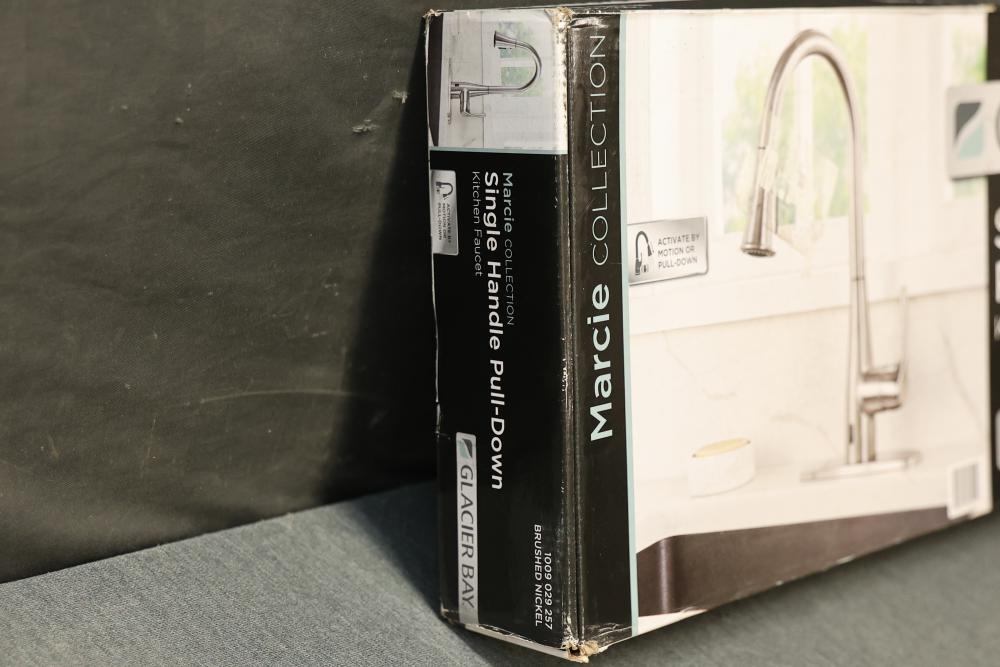 Glacier Bay Marcie Single-Handle Integrated Pull-Down Touchless Kitchen Faucet in Stainless Steel (Model RF412034). Features a brushed nickel finish, touchless technology, and a pull-down spray head. Includes installation instructions and components shown in original packaging. The item is new and appears unused. Pickup only.
