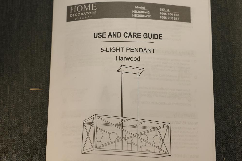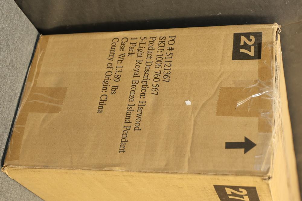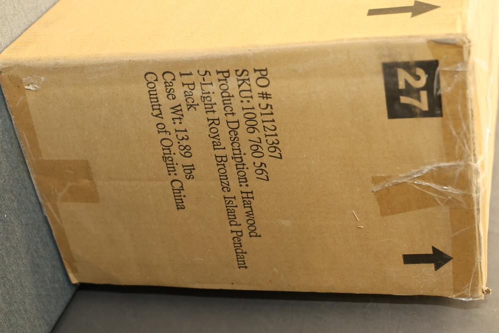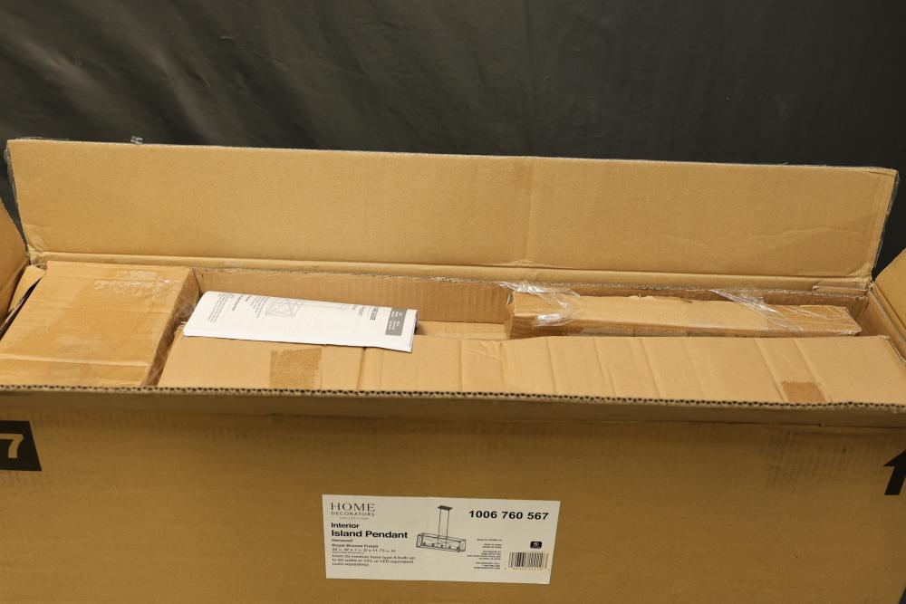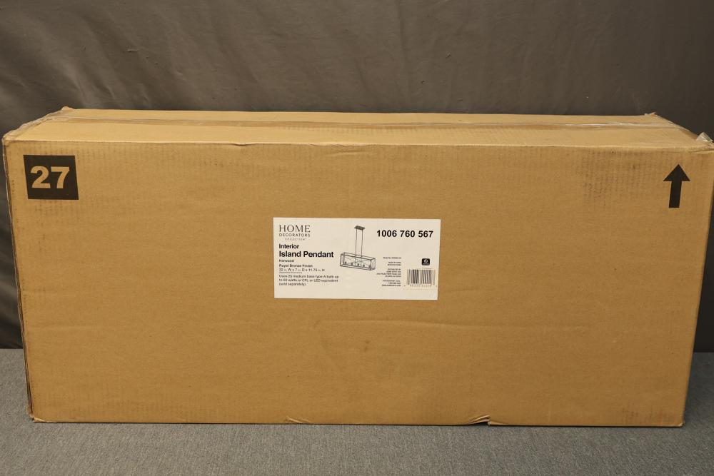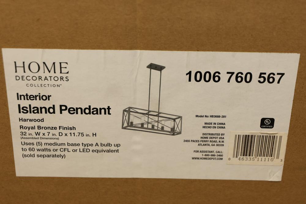 Home Decorators Collection Harwood 5-Light Interior Island Pendant in Royal Bronze Finish. Model HB3688-281. Designed for indoor use, this island pendant features a royal bronze finish and measures 32 inches W x 7 inches D x 11.75 inches H. Utilizes five (5) medium base Type A bulbs up to 60 watts or CFL/LED equivalent (sold separately). Item is new in original packaging. Pickup only.