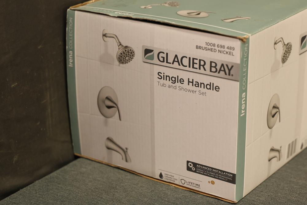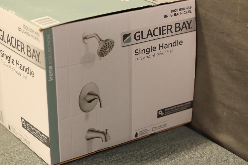 Glacier Bay Irena Single-Handle 6-Spray Tub and Shower Faucet in Brushed Nickel (Model HD873X-8E04). This faucet includes a six-spray showerhead, single-handle control, and tub spout. Made from durable materials with a brushed nickel finish. Pieces are packaged securely in the original box and include all components as shown. Pickup only.