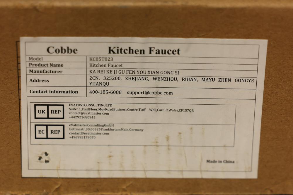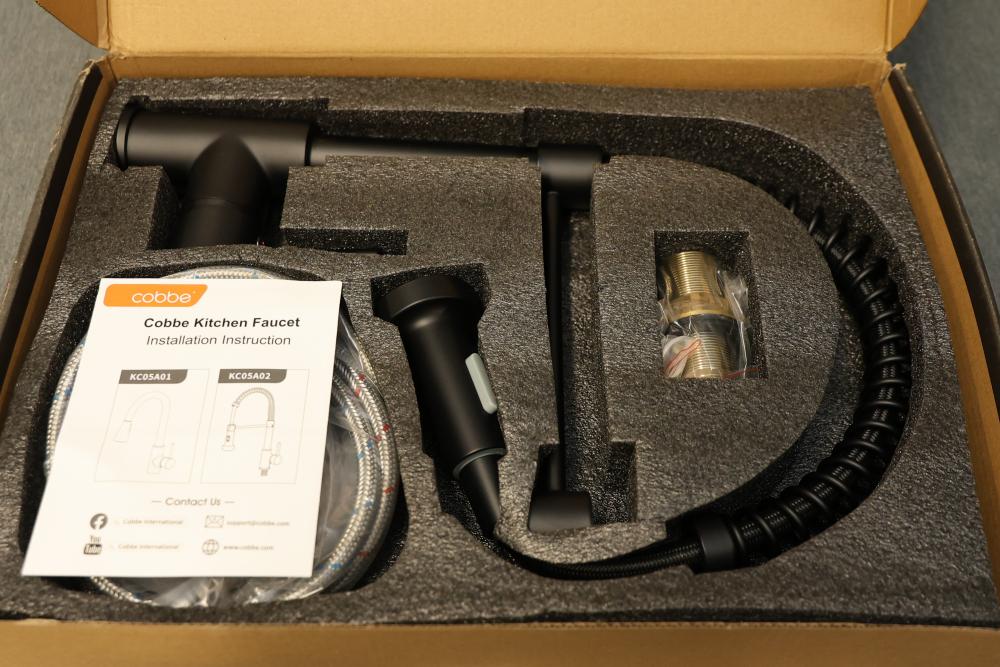 Cobbe Single-Handle Stainless Steel Kitchen Sink Faucet with Pull Out Sprayer in Black (Model KC05T023). Features a pull-out sprayer and single-handle design for easy use. Made from stainless steel with a sleek black finish. Comes in original packaging with installation instructions and included components. Pickup only.