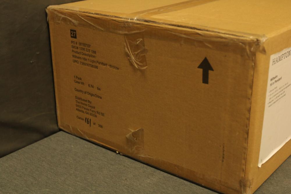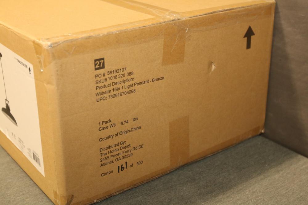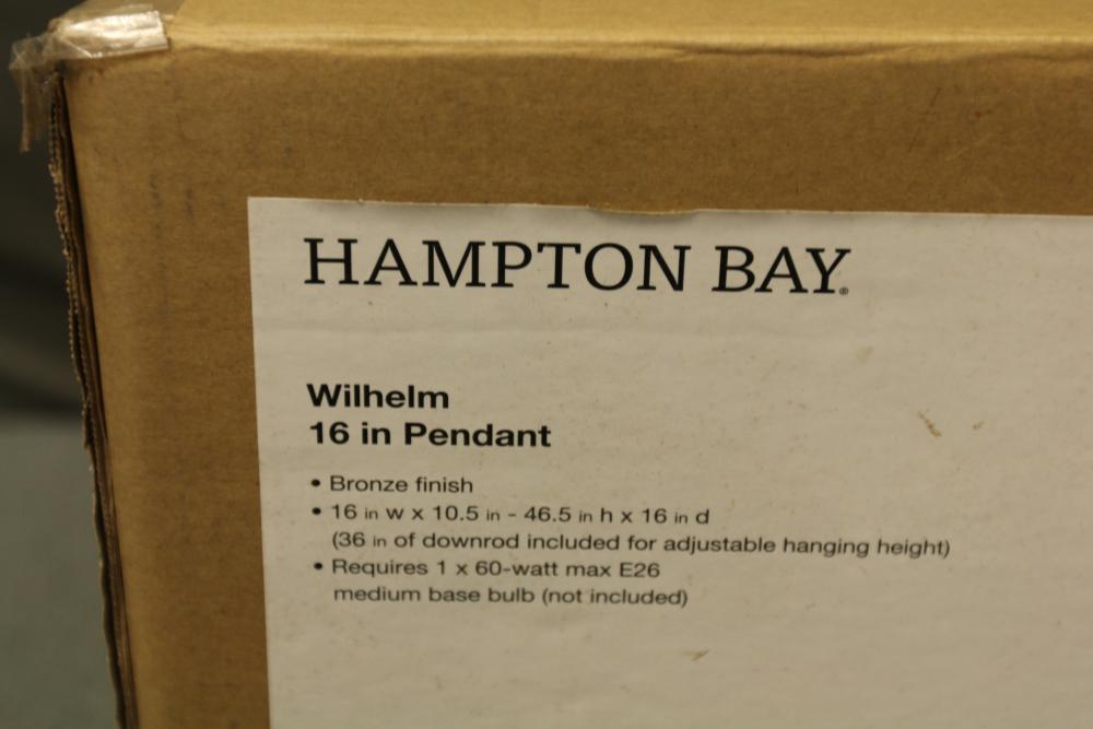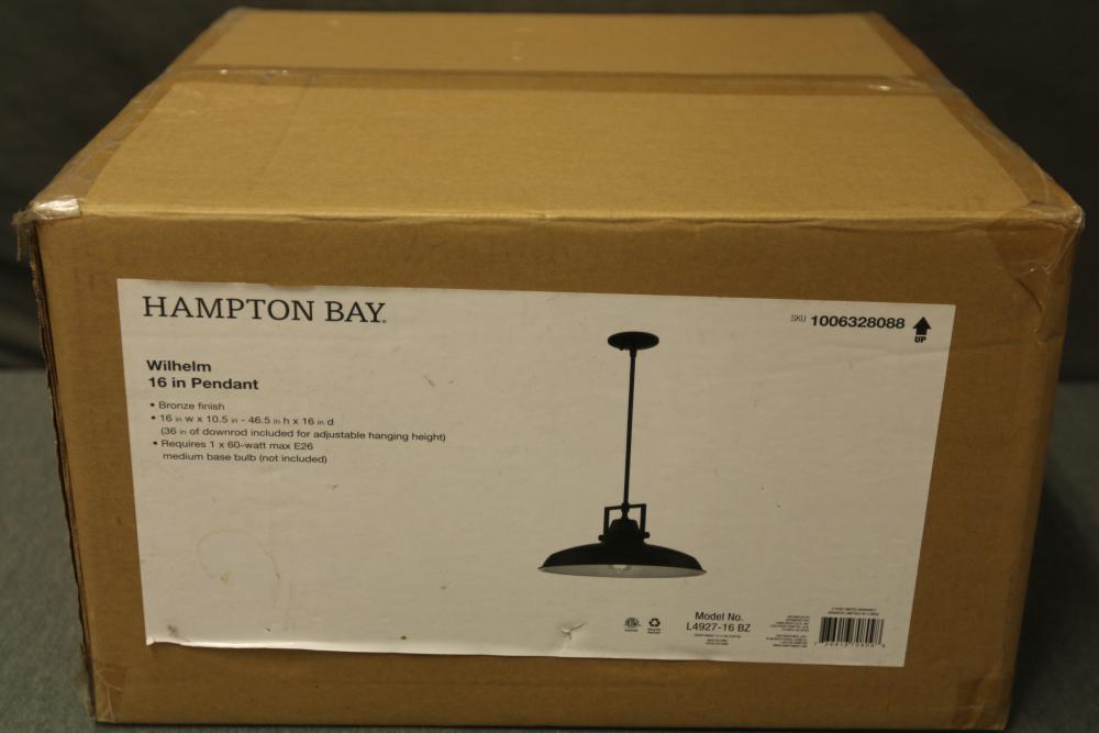 Hampton Bay Wilhelm 16 Inch 1-Light Bronze Industrial Farmhouse Pendant Light Fixture with Metal Shade (Model L4927-16BZ). Features a durable bronze finish, metal shade, and adjustable 36-inch downrod for a maximum hanging height of 46.5 inches. Requires one 60-watt max E26 medium base bulb (not included). Pickup only.