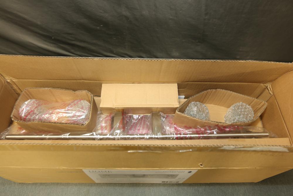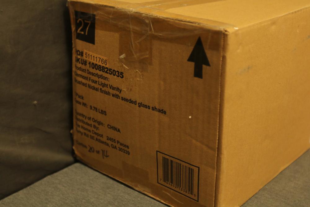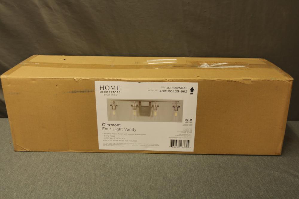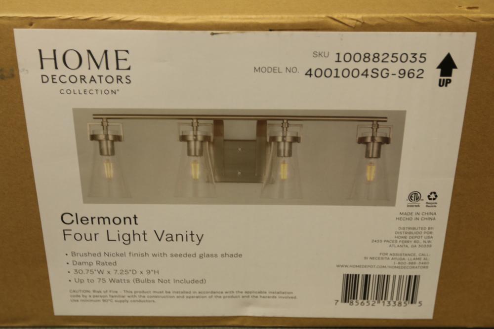 Home Decorators Collection Clermont 30.75 Inch 4-Light Brushed Nickel Bathroom Vanity Light with Seeded Glass Shade (Model 4001004SG-962). Features a brushed nickel finish with seeded glass shades and a deep base design. Measures 30.75 inches by 7.32 inches by 8.96 inches. Bulbs are not included. Pickup only.