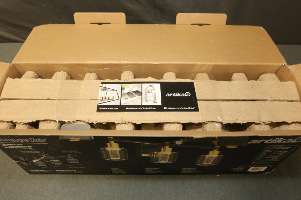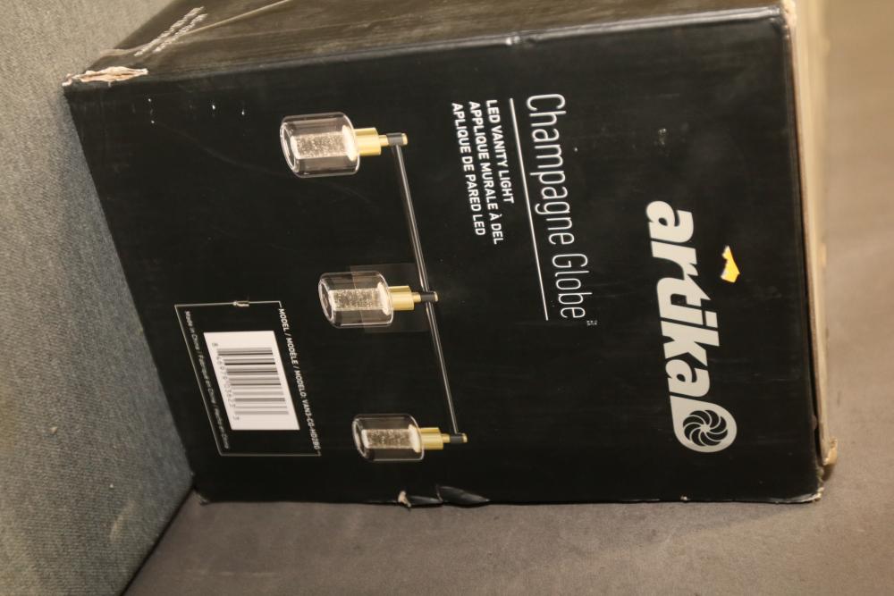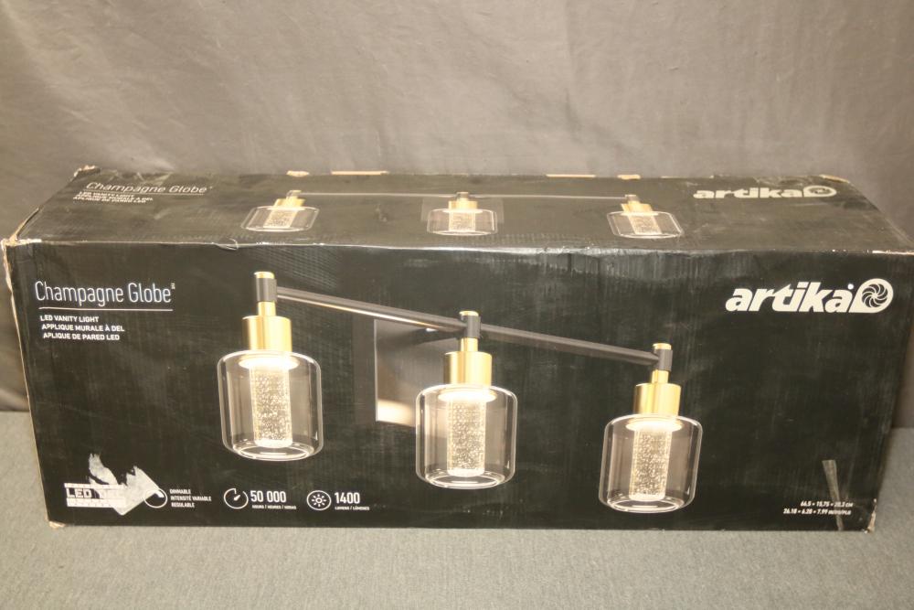 Artika Champagne Globe 26 Inch 3-Light Black and Gold Modern Integrated LED 5 CCT Vanity Light Bar for Bathroom with Bubble Glass (Model VAN3-CG5C-HD2BG). Features black and gold finishes with bubble glass shades. Integrated LED technology with a brightness of 1400 lumens, color temperature of 3000K, and lifespan of 50,000 hours. Measures 26 inches in width. Pickup only.