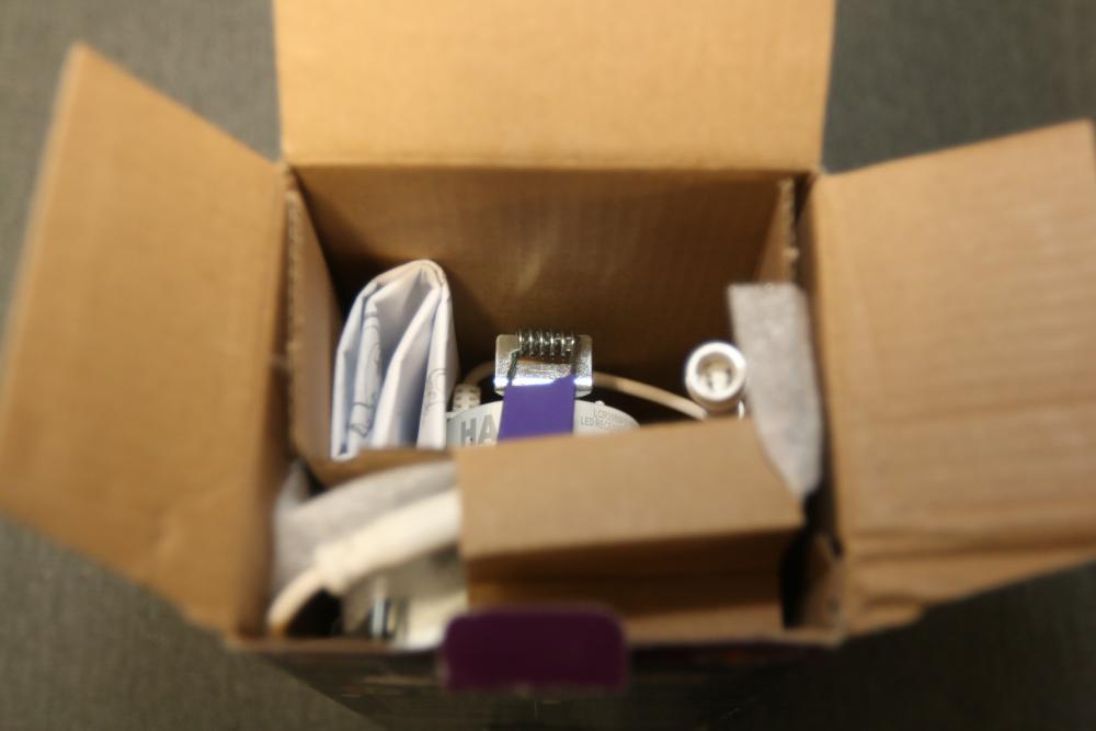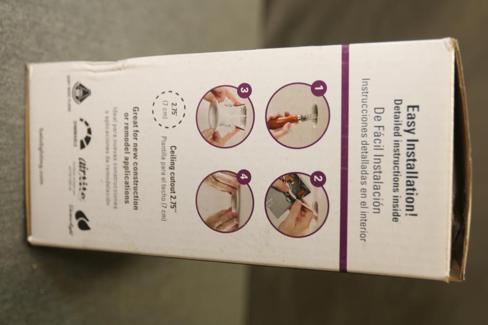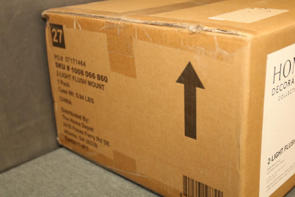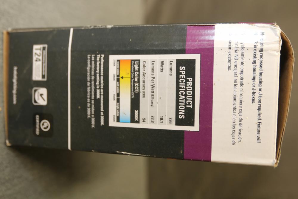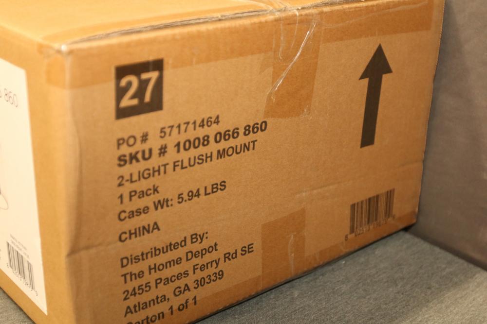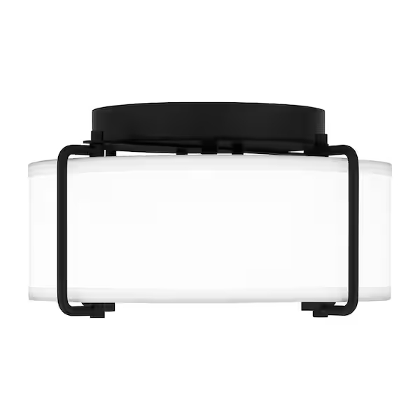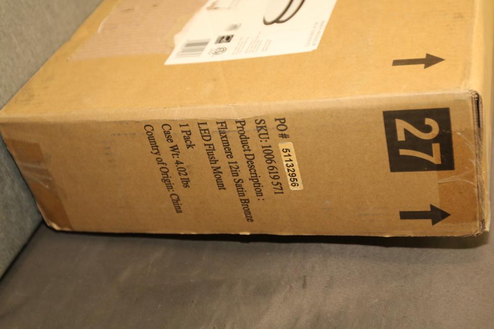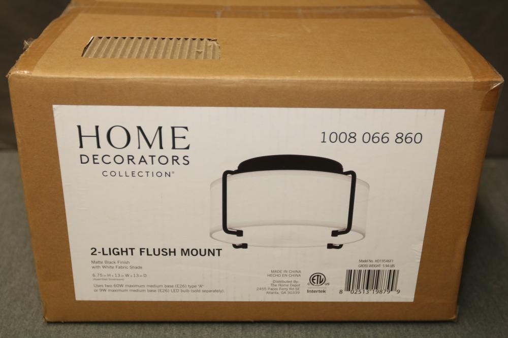 Home Decorators Collection 13 Inch 2-Light Matte Black Flush Mount with White Fabric Shade (Model HD19546F1), Hampton Bay Flaxmere 12 Inch Bronze Finish Dimmable LED Flush Mount Ceiling Light with Frosted White Glass Shade (Model HB1023C-34), and Halo 2 Inch Soft White Selectable CCT Integrated LED Recessed Light with Surface Mount White Trim Retrofit Module (Model LCR2089FS1EMW). Pickup only.