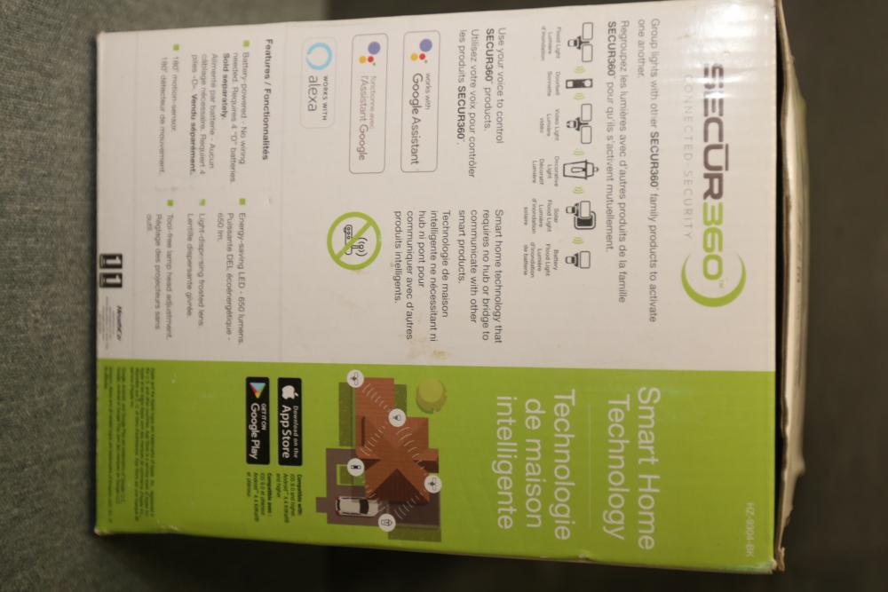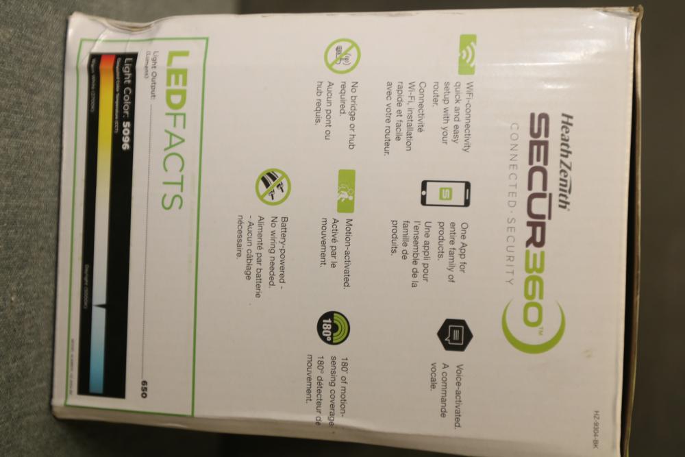 Heath-Zenith Secur360 Connected LED Battery Security Motion Light (Model HZ-9304-BK). This motion-activated light features a 180-degree detection area and integrates with smart home technology, compatible with Google Assistant and Amazon Alexa. Battery-powered and app-controlled, it allows remote activation and voice commands. The light is designed with a bright 5050K LED providing optimal illumination. The original packaging is included. Pickup only.