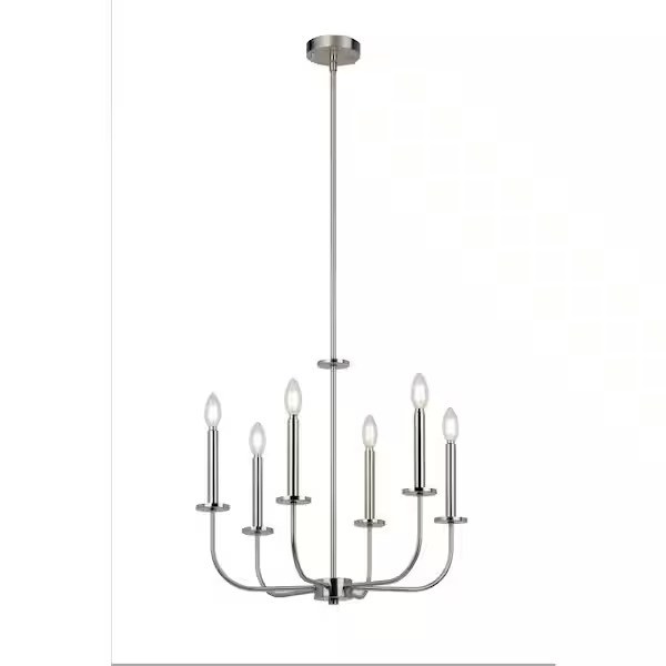 Hampton Bay Tilden 6-Light Brushed Nickel Chandelier (Model KSH9106AX-01/BN). Features a brushed nickel finish and accommodates (6) candelabra bulbs up to 60 watts each or CFL/LED equivalents. Assembled dimensions are 21.5 in W x 21.5 in H with an adjustable hanging height up to 46.62 in. Light bulbs are not included. Pickup only.