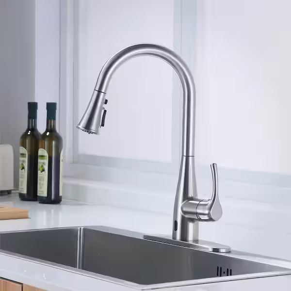 Glacier Bay Marcie Single-Handle Integrated Pull-Down Touchless Kitchen Faucet in Stainless Steel (Model RF412034). Features a brushed nickel finish, touchless technology, and a pull-down spray head. Includes installation instructions and components shown in original packaging. The item is new and appears unused. Pickup only.