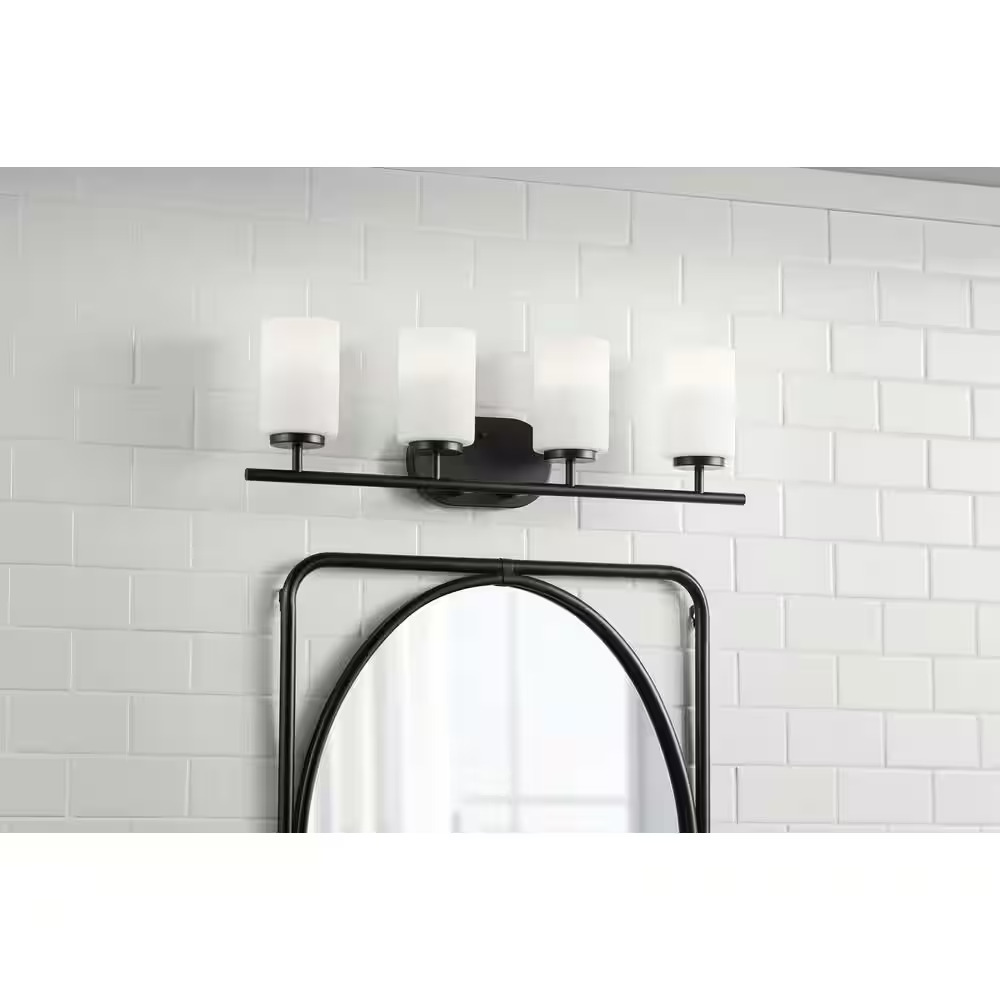 Home Decorators Collection Tatum 4-Light Matte Black Vanity Light with White Opal Glass Shades (Model W772A04BK). Measures 27.5 inches in width, 8.5 inches in height, and 5.5 inches in extension. Features four white opal glass shades and accommodates dimmable bulbs up to 100 watts or LED equivalents, sold separately. The fixture is new in original packaging and includes mounting instructions. Pickup only.